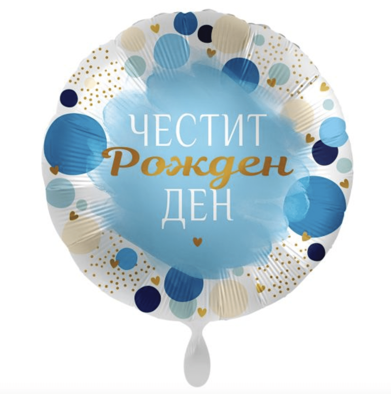 Добавете стил и празнично настроение към рождения ден с този красив кръгъл фолиев балон в синьо-златна гама. Балонът е с надпис „Честит Рожден Ден“ и е украсен с модерни точки и сърчица в синьо, златно и бяло.