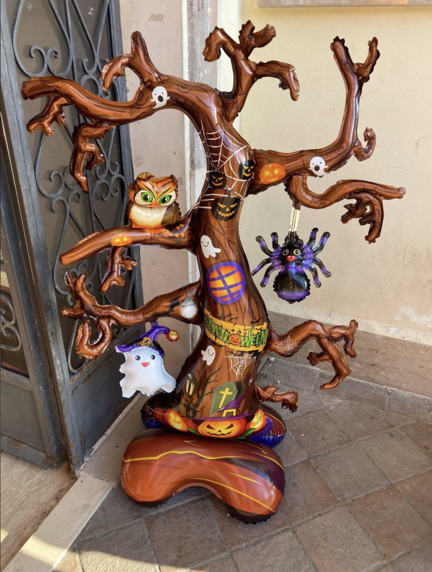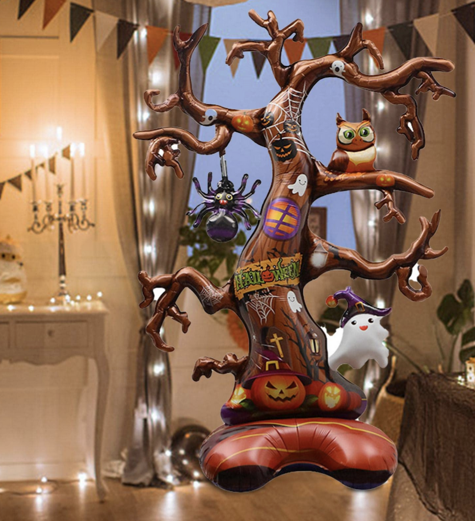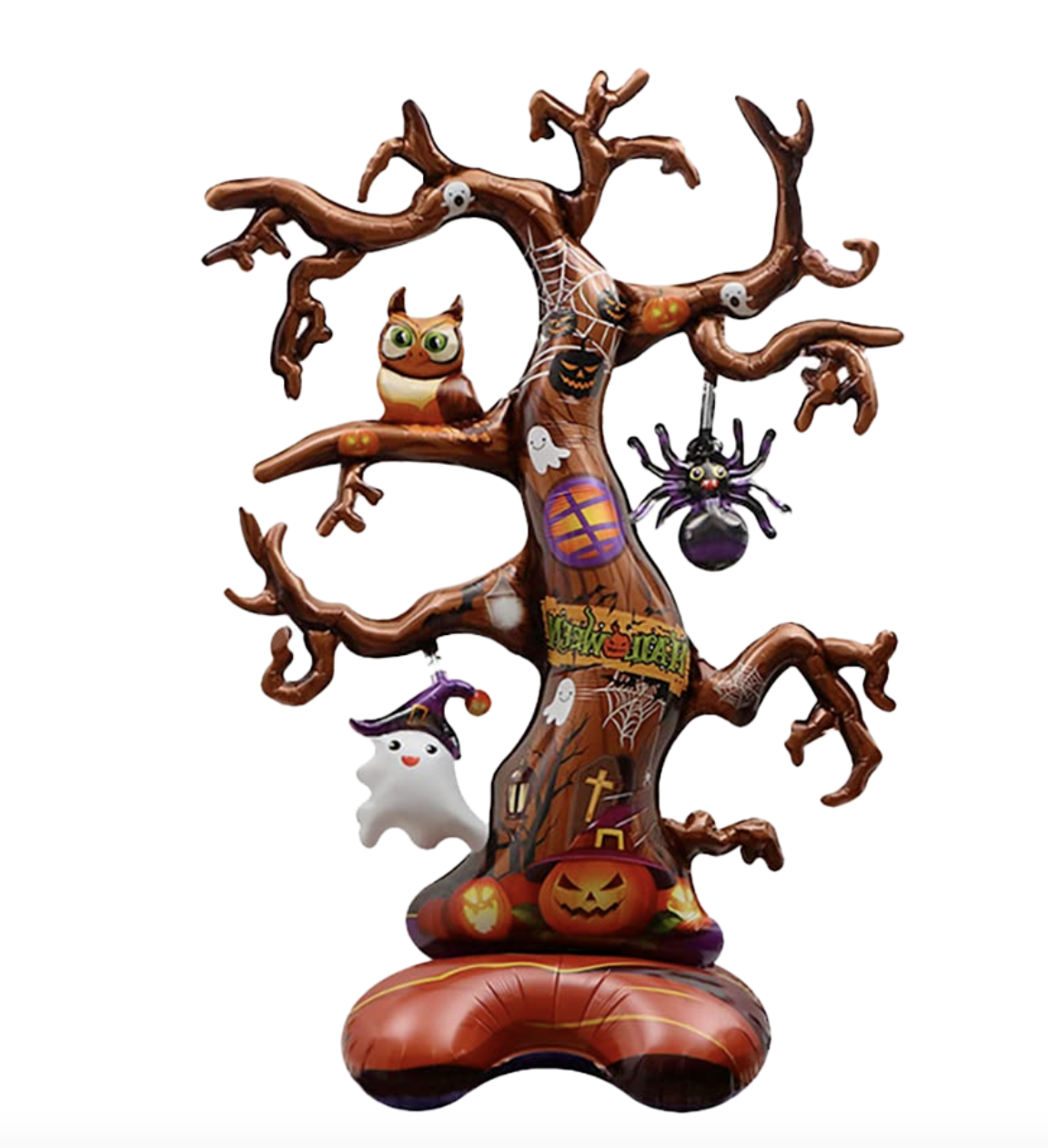 Направете вашето Хелоуин парти още по-впечатляващо с този голям стоящ фолиев балон във формата на страховито дърво! Декориран с призрак с шапка, бухал, паяк, тикви и паяжини, този балон е истински акцент за всяко тържество. Благодарение на стабилната си основа, стои изправен и е чудесен за украса на парти, заведение, магазин или фотокът.