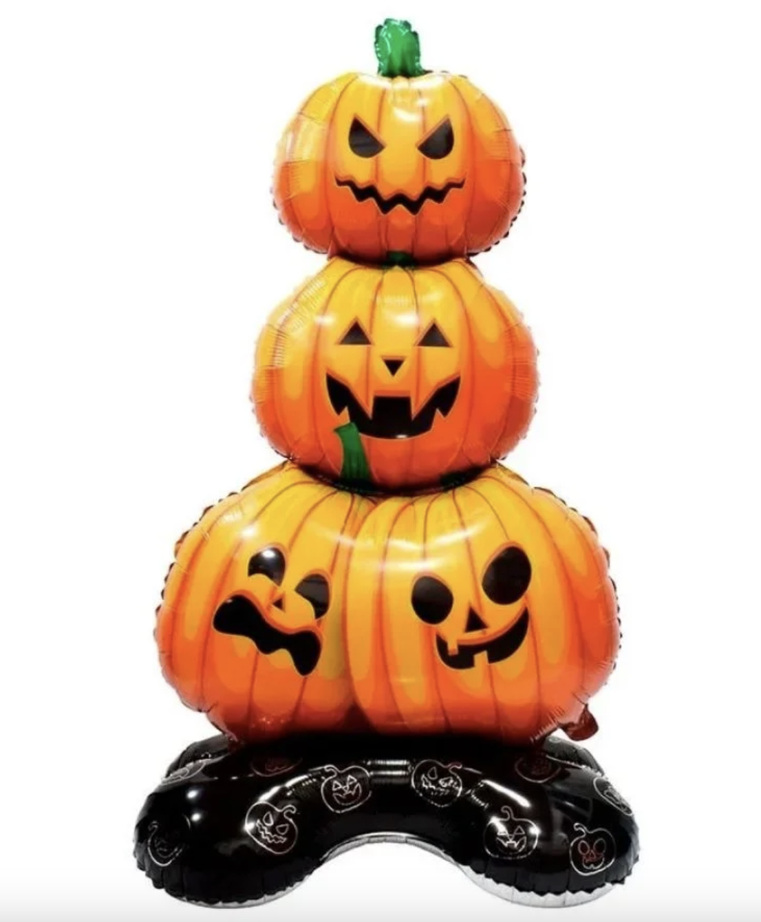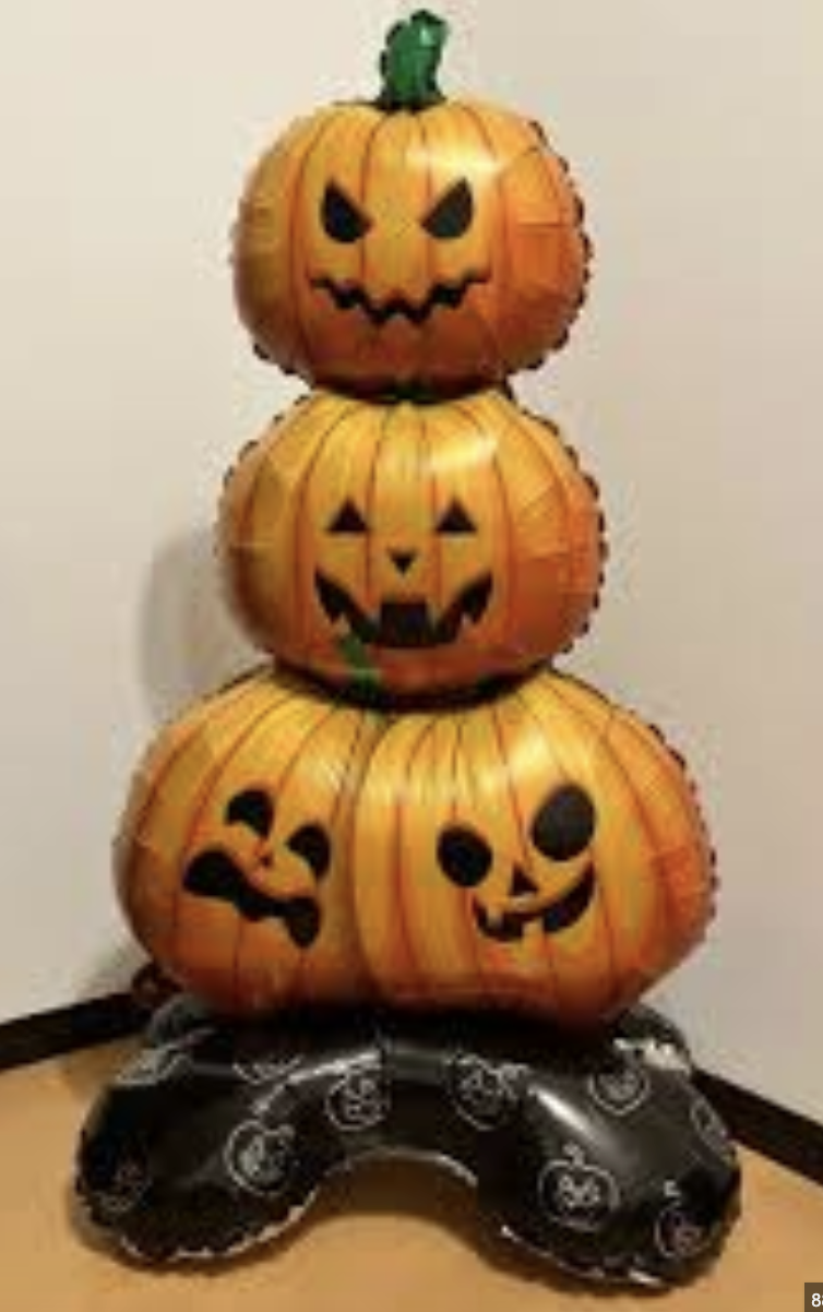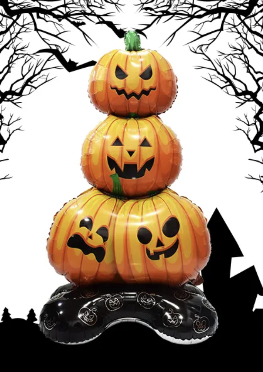 Създайте страхотна празнична атмосфера за Хелоуин с този впечатляващ фолиев балон на три тикви с различни усмивки и страшни лица! Балонът е голям, ярко оранжев и стои върху стабилна черна основа, украсена с тиквени мотиви. Подходящ е за декорация на Хелоуин парти, витрина, детско тържество или тематична фотосесия.