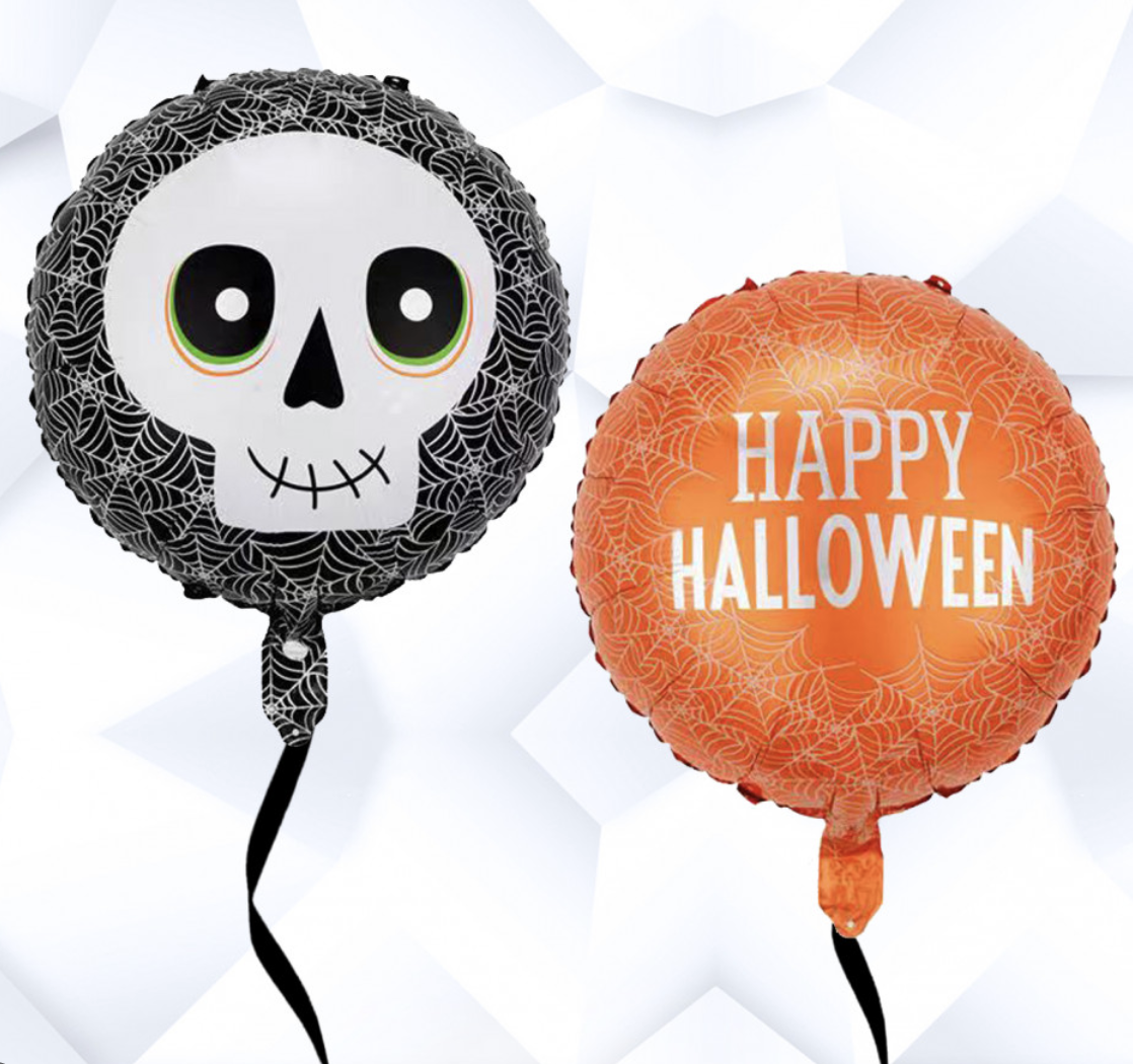 Страхотен двулицев фолиев балон, идеален за всяко Halloween парти! От едната страна е весел череп с паяжини, а от другата – ярко оранжев надпис “Happy Halloween”. Подходящ за украса на зала, магазин, заведение или като допълнение към тематичен подарък. Може да се надува с въздух или хелий.