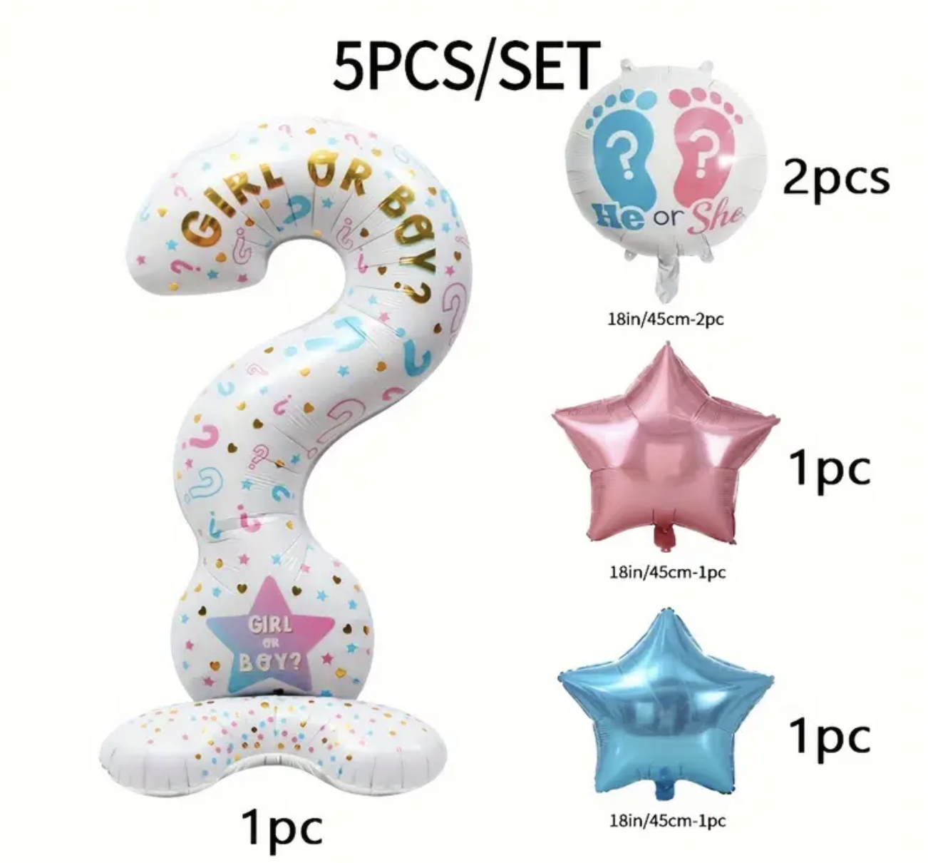 Комплекта съдържа:1 брой Настолен фолио балон с надпис BOY or GIRL 110 см | 2 броя балони с крачета и надпис HE or SHE по 45 см и 2 броя звезди (синьо и розово) – 45 см
