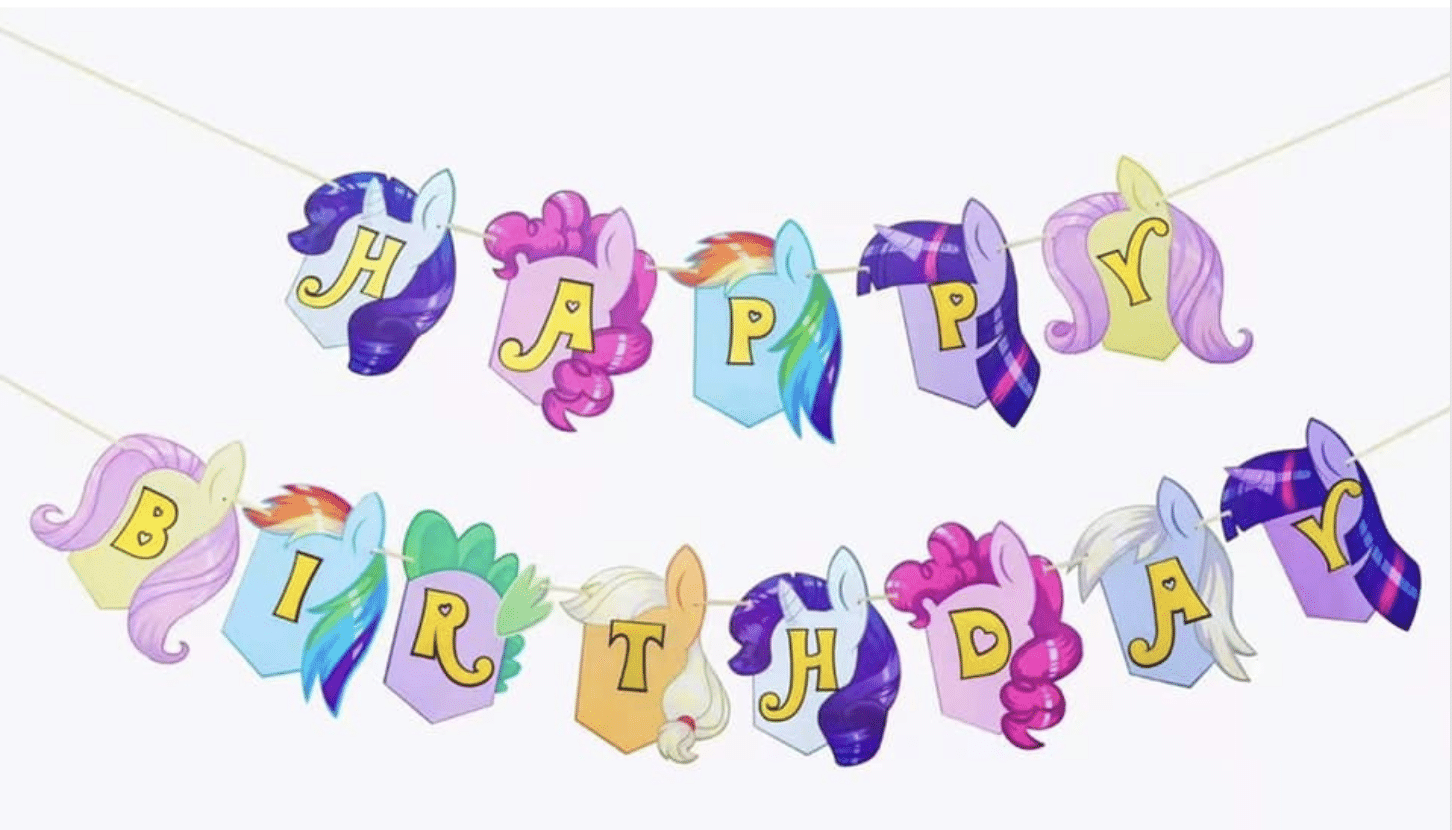 Очарователен парти банер с надпис “Happy Birthday” и красиви еднорози и пастелни цветове – идеален за магическо рождено парти!