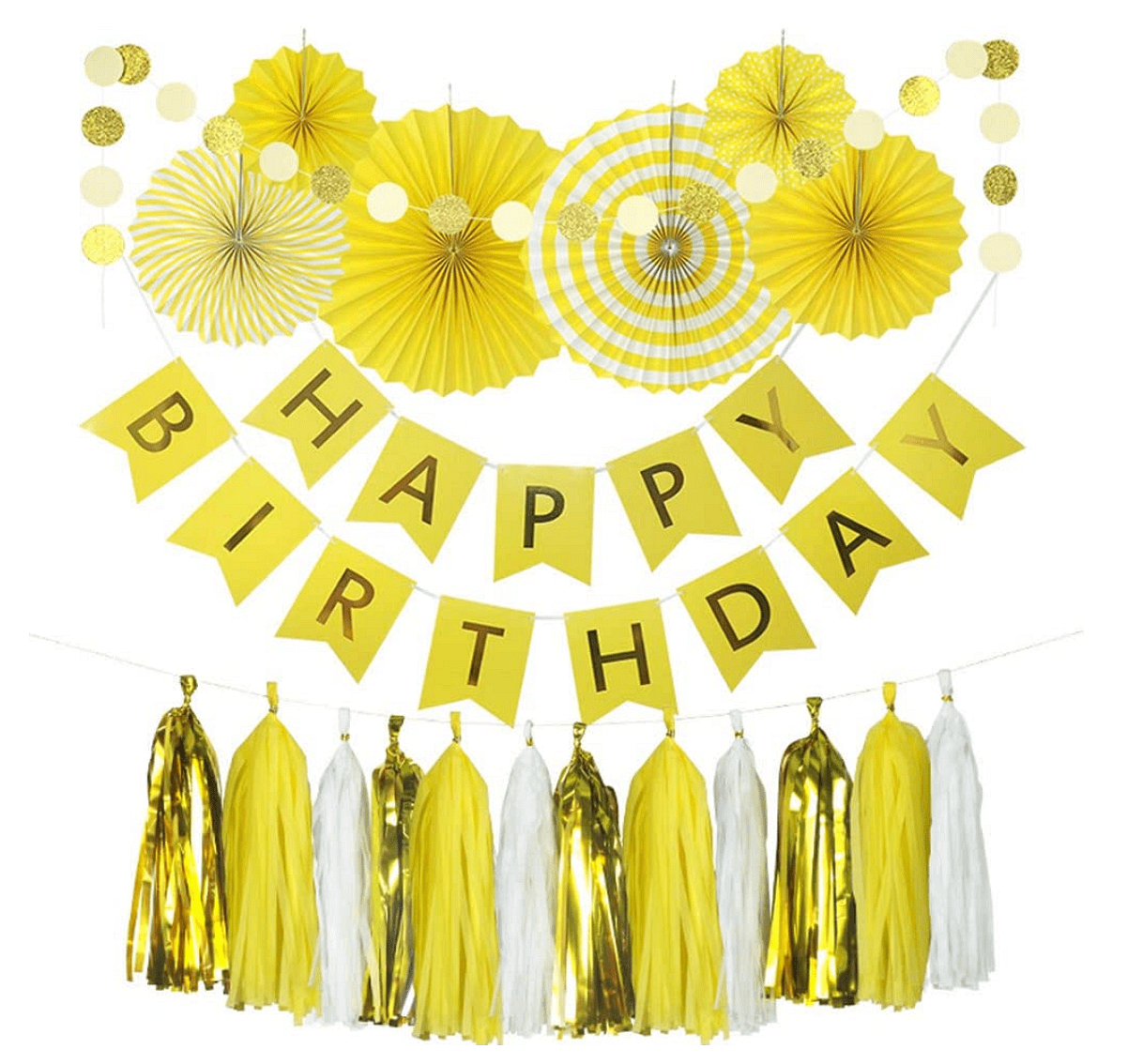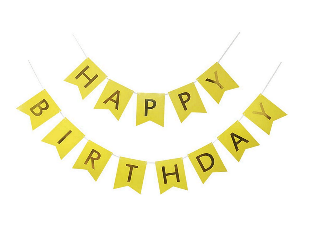 Луксозен и много стилен банер в жълт със златни букви – надпис HAPPY BIRTHDAY + лента за декориране