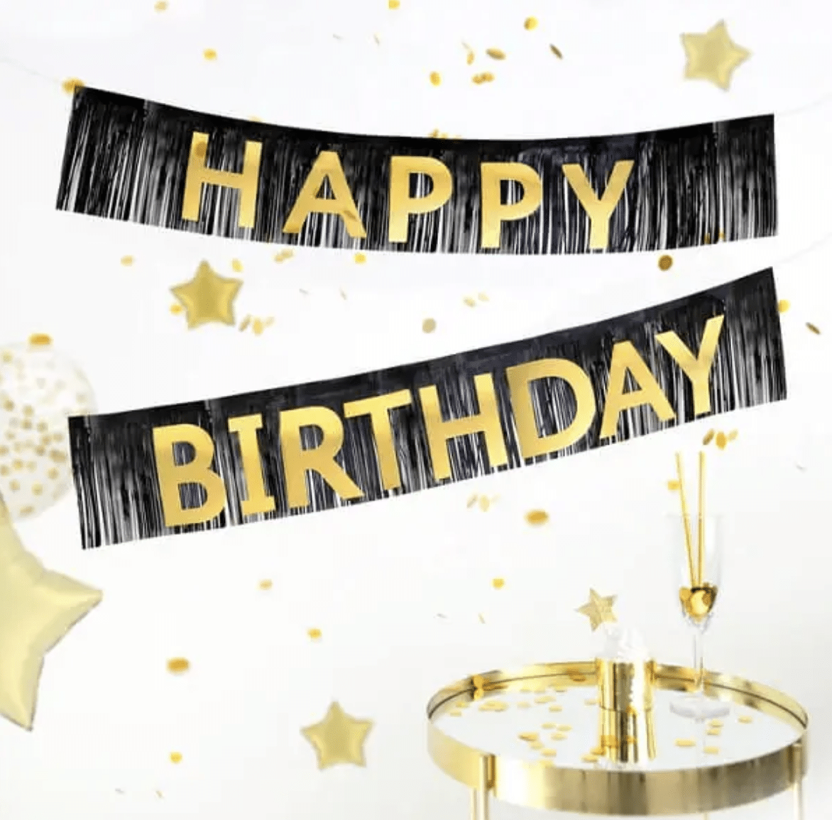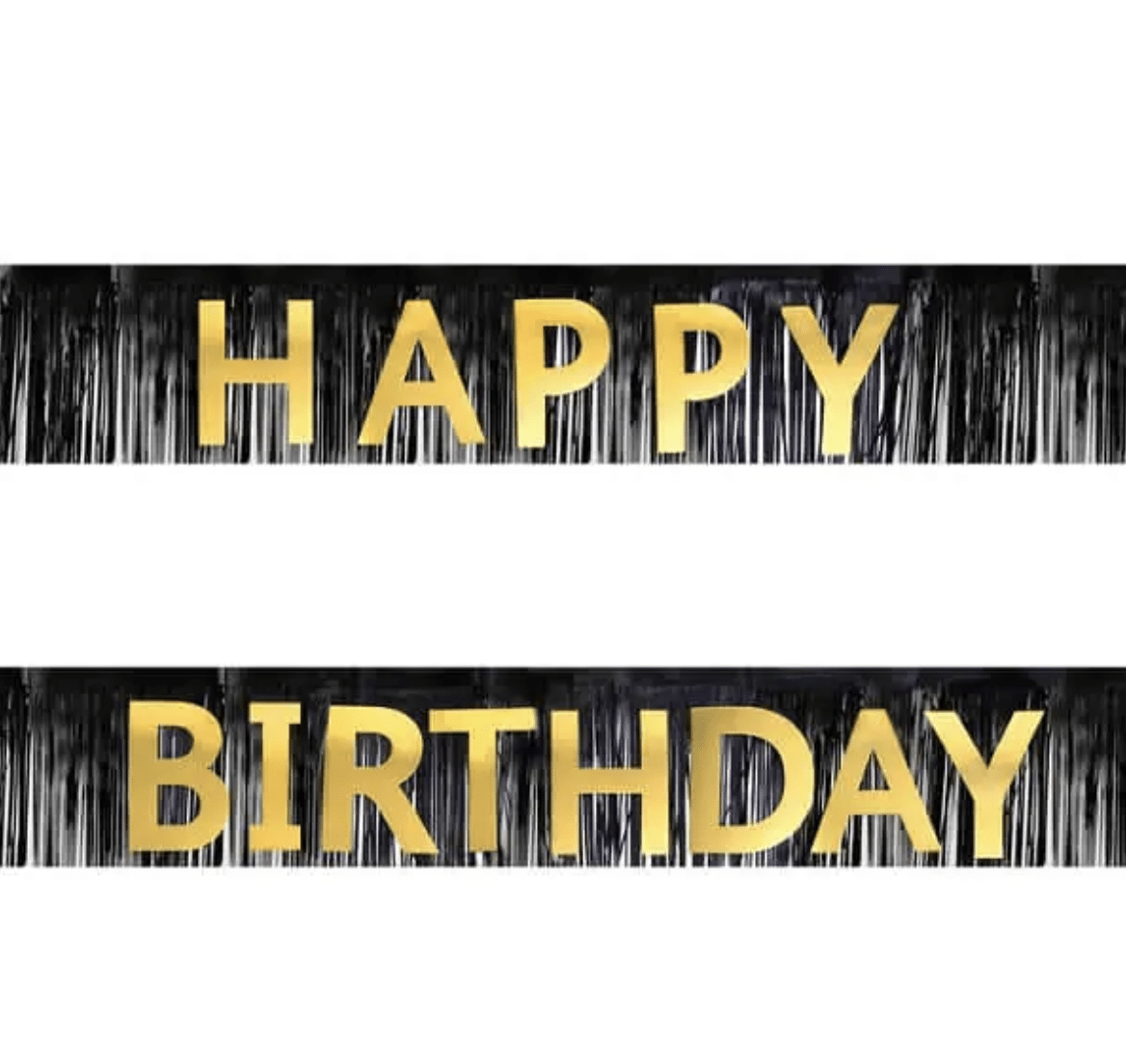 Стилен банер за рожден ден с ресни в черно и златно. Дължина 200 см, подходящ за декорация на стена, маса или фотокът.