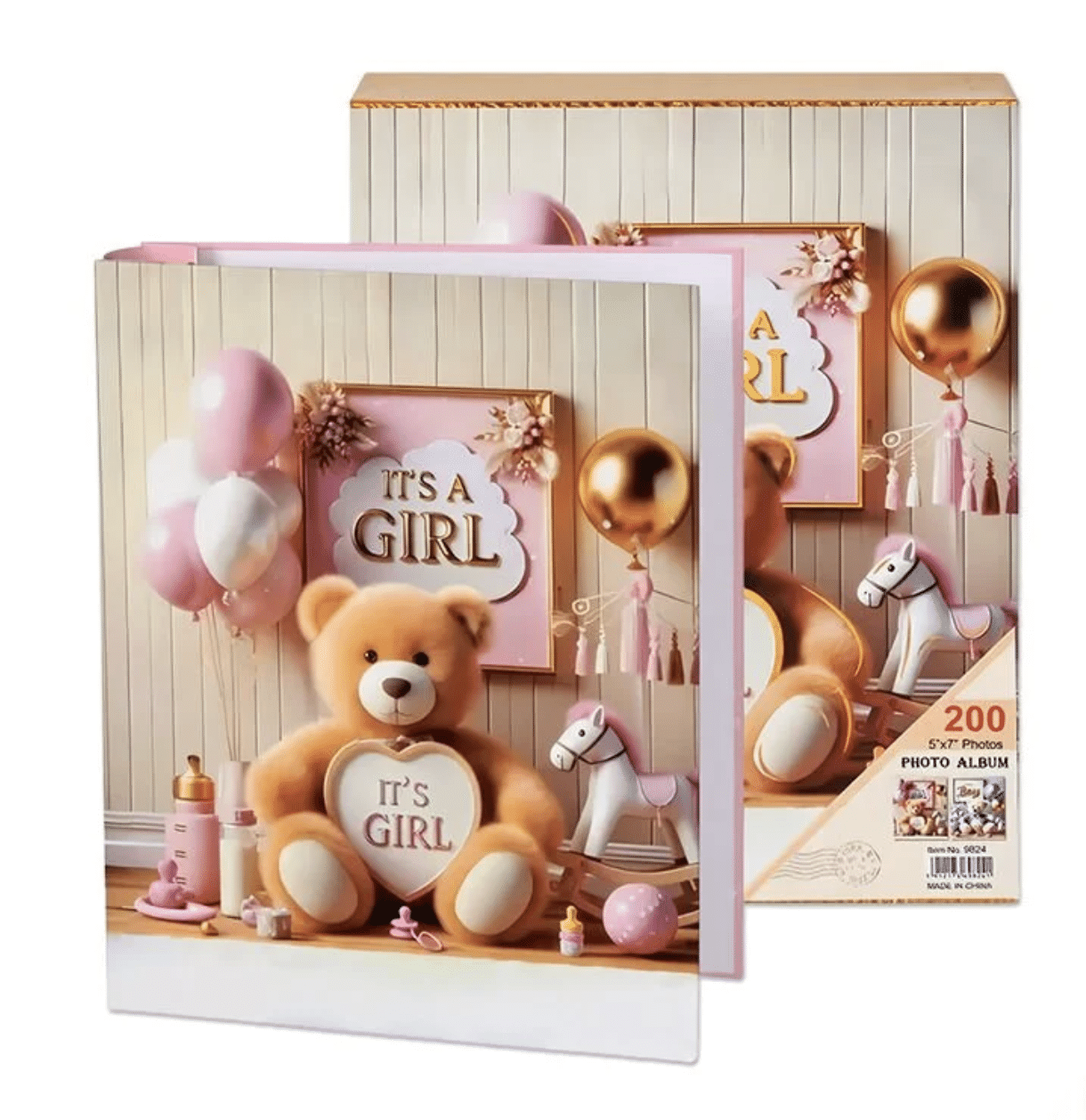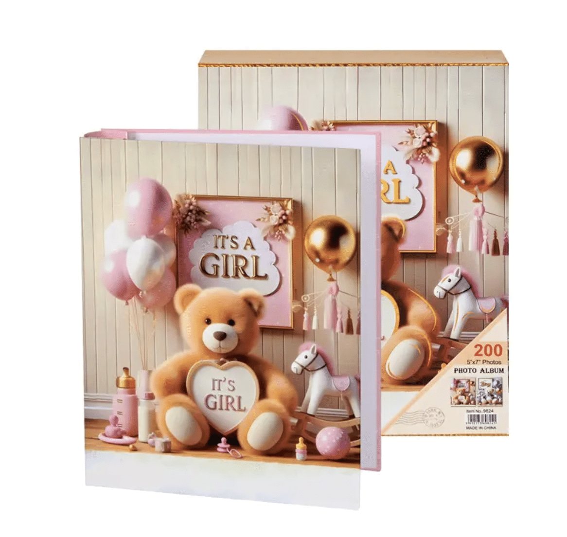 Дизайн: Очарователна корица с пухкаво мече, балони и конче, налична в два варианта – нежно розов за момиче („It’s a Girl“)