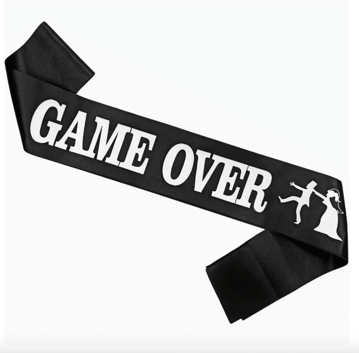Добавете доза хумор към моминското или ергенското парти с тази емблематична лента! Дизайнът „GAME OVER“ е класика в парти аксесоарите, символизираща шеговито края на „свободния живот“ и началото на семейното приключение.