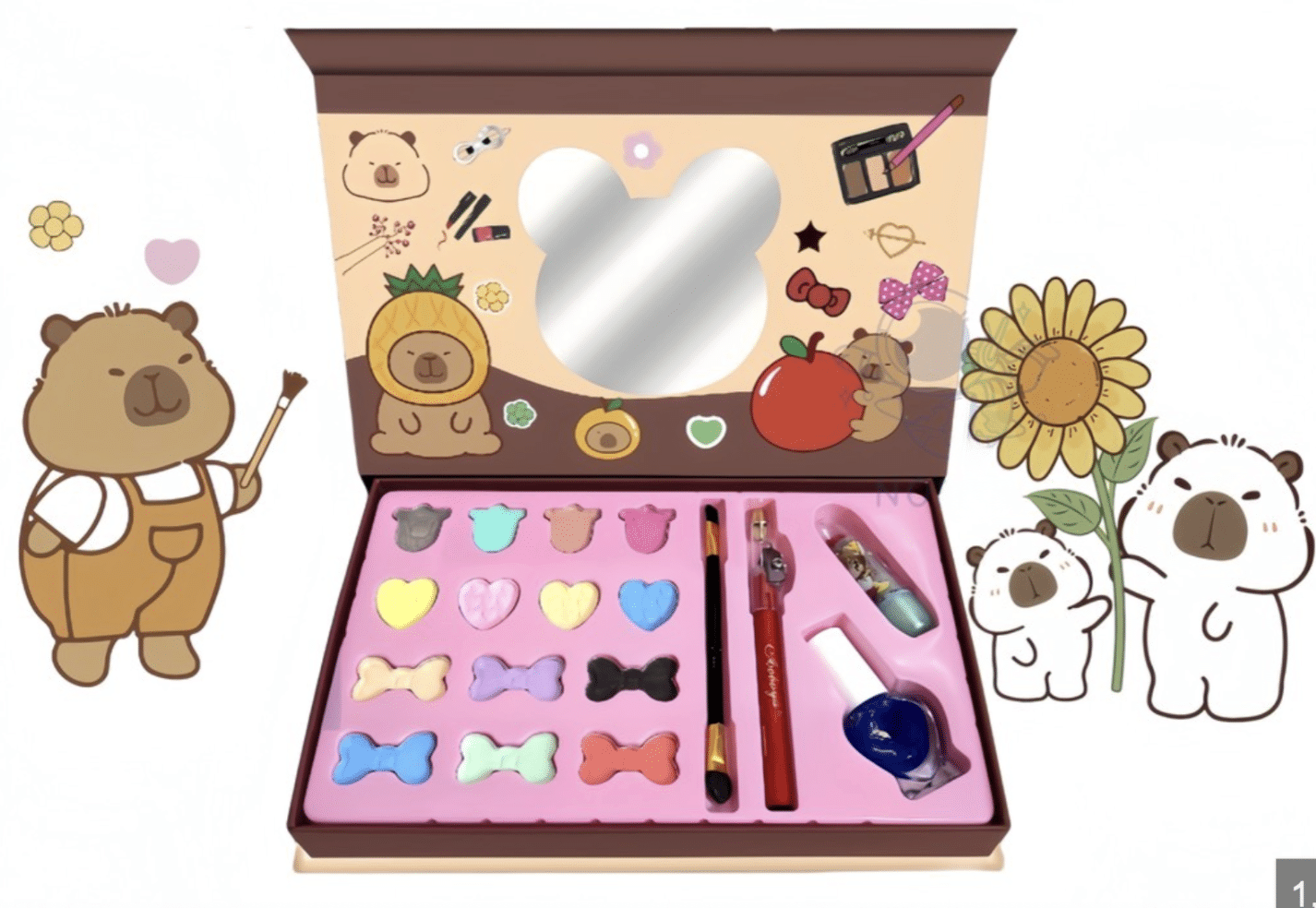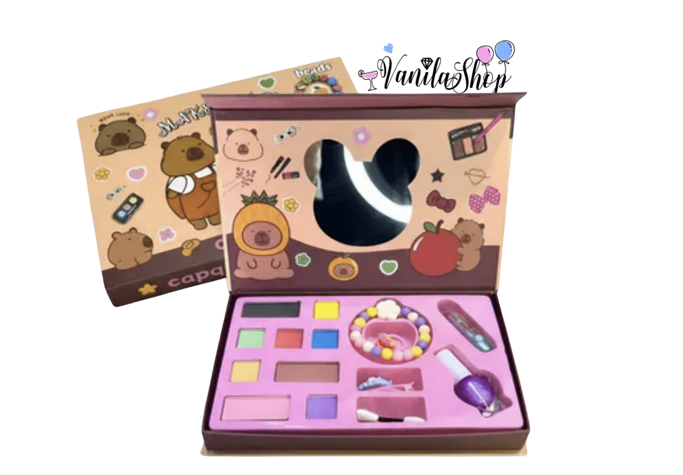 Сладък и стилен детски козметичен комплект с капибара дизайн, поднесен в красива кутия тип книжка с огледалце. Създаден специално за малки момичета, които обичат ролевите игри, разкрасяването и творческите занимания.