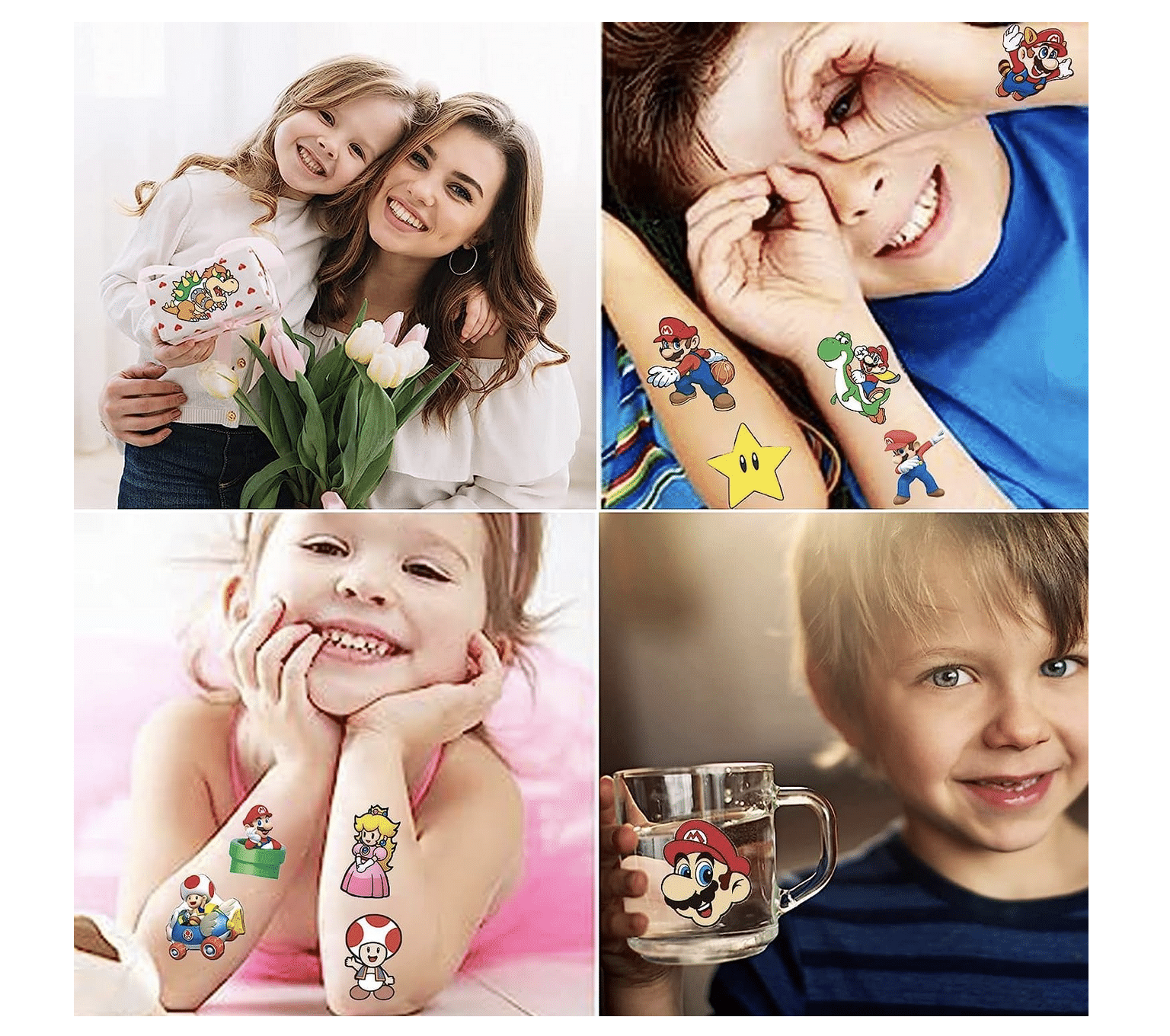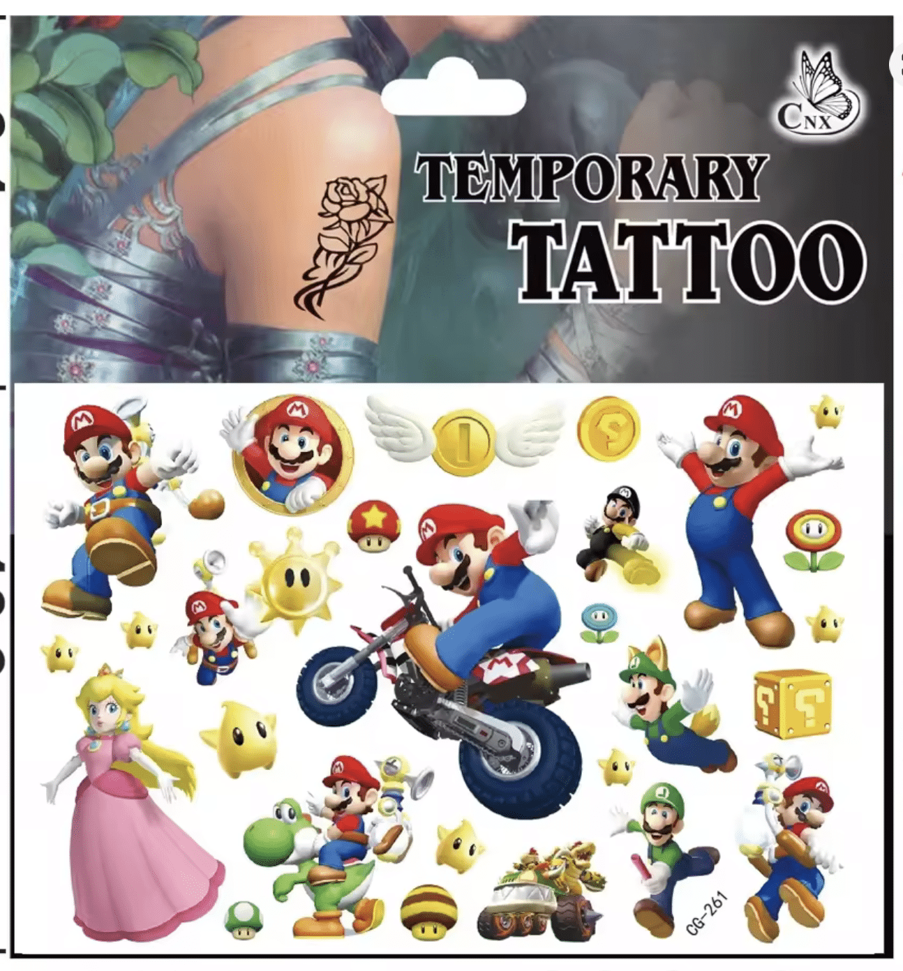 Забавен комплект от временни детски татуировки с героите от Super Mario – идеални за парти изненади, подаръчета или украса по време на рожден ден!