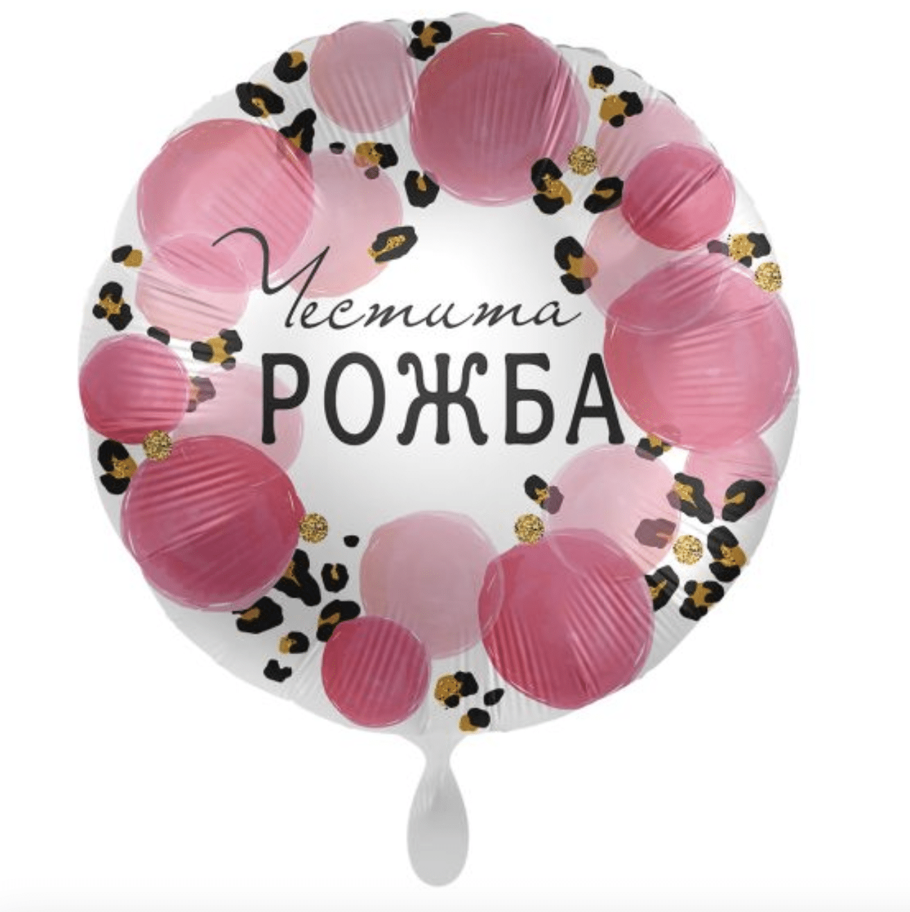Елегантен и модерeн балон, идеален за посрещане на новородено или празнуване на специалните първи моменти. Балонът е украсен с нежни розови балони в кръг около надписа „Честита рожба“, допълнени с акценти в леопардови шарки и златисти елементи — стилна комбинация, която придава ефектност на всяка украса.