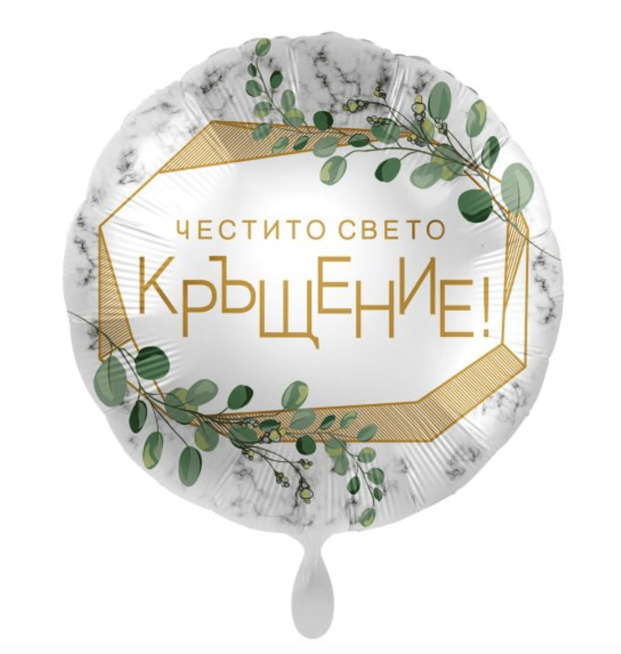 Елегантен фолиев балон с надпис „Честито Свето Кръщение!“, идеален за декорация на празника на кръщенето. Дизайнът комбинира мраморен фон, златна рамка и зелени листа – придавайки стил и изисканост на всяка празнична обстановка.