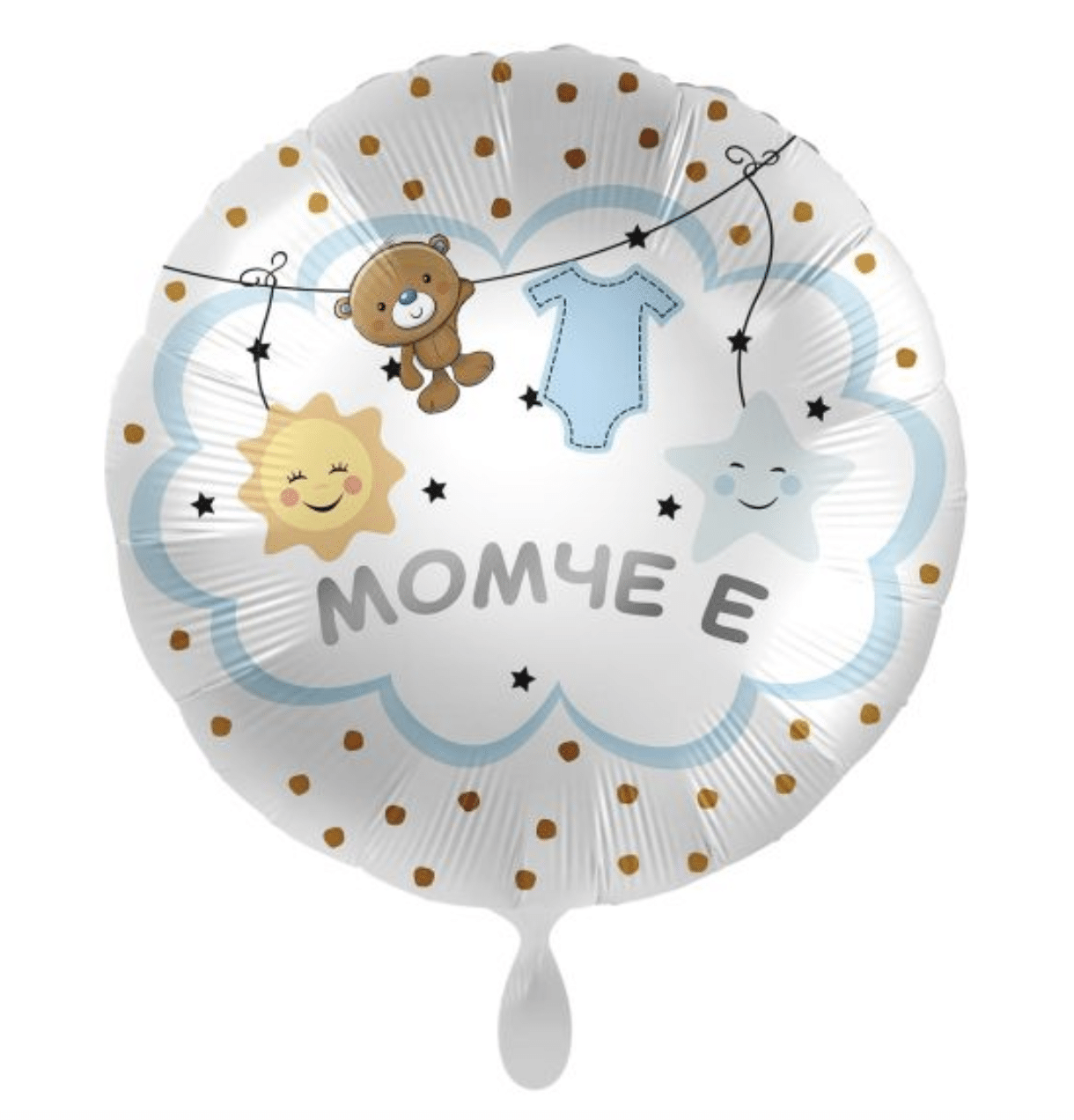 Кръгъл фолиев балон с надпис „Момче е“ – перфектен избор за празнуване на появата на малкия принц! Балонът е в нежни сини и златни тонове, с красиви детайли – усмихнати звездички, слънце, плюшено мече и бебешко боде. Подходящ за baby shower, изписване от родилния дом или разкриване пола на бебето.