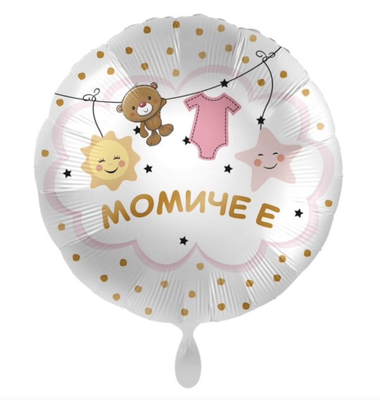Кръгъл фолиев балон с надпис „Момиче е“ – идеален за празнуване на появата на малката принцеса! Балонът е в нежни розови и златни тонове, украсен с усмихнати звездички, слънце, плюшено мече и бебешко боде – сладък и ефектен акцент за всяко baby shower или разкриване пола на бебето.