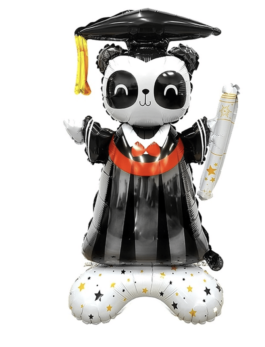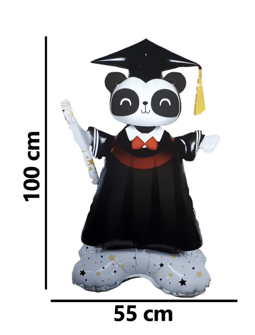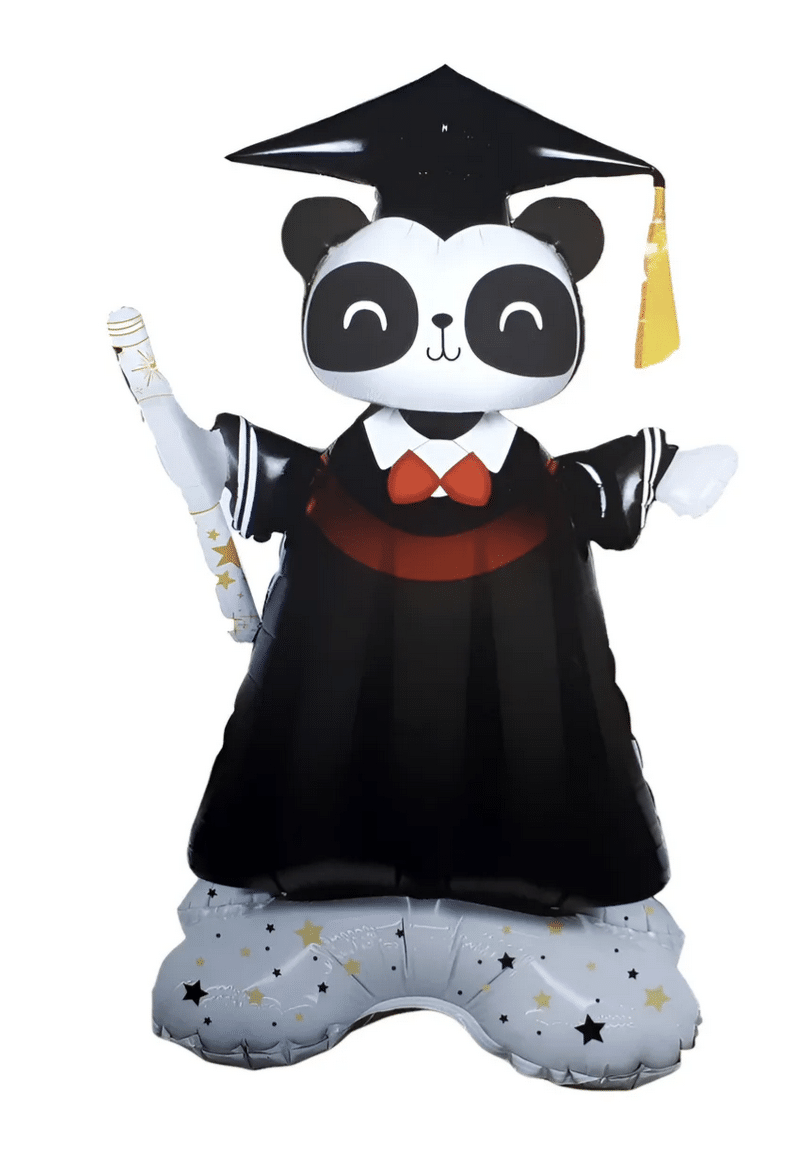 Очарователен стоящ фолиев балон с панда в абитуриентско облекло – идеалната украса за празнуване на завършване и нови начала!