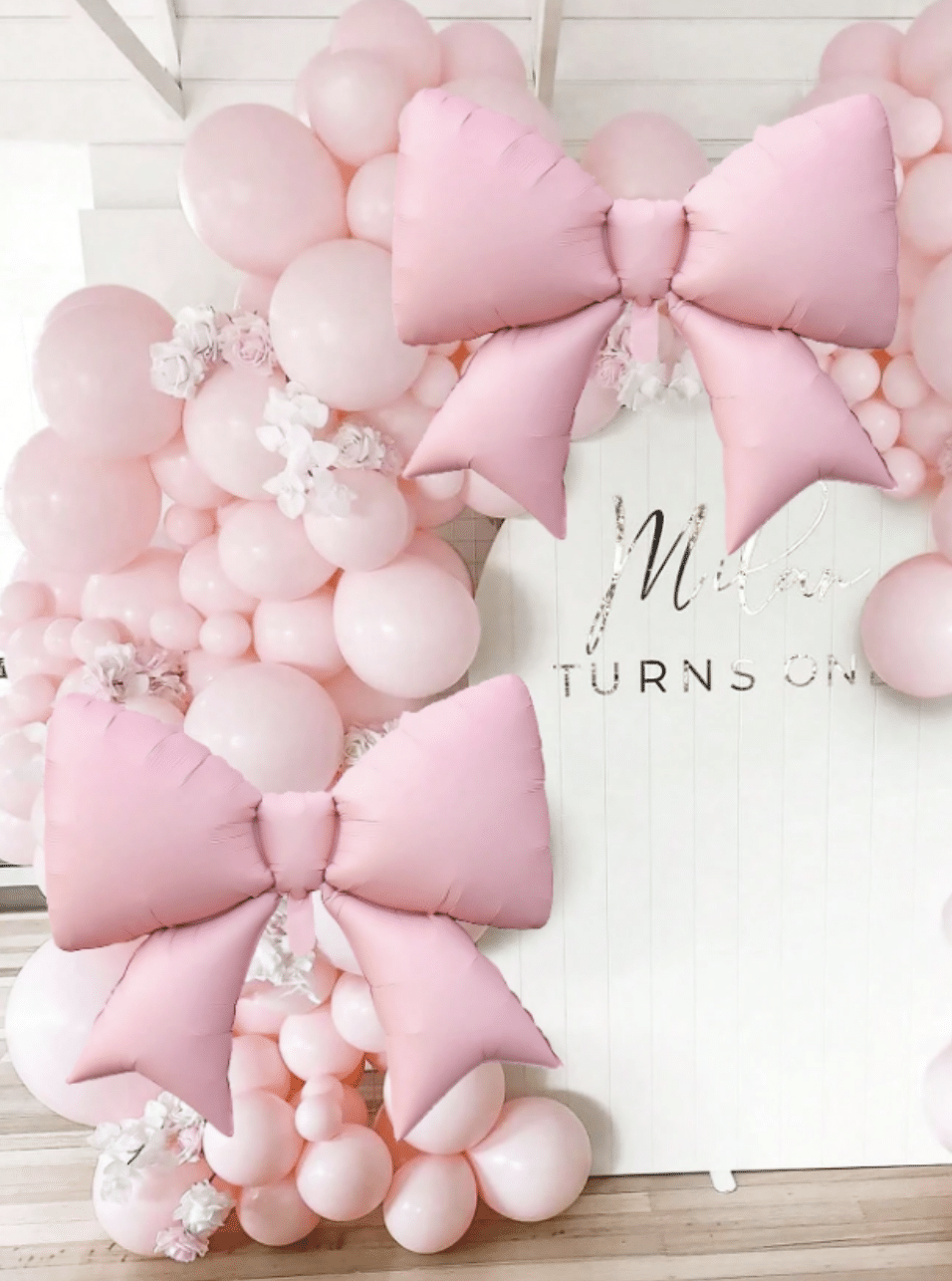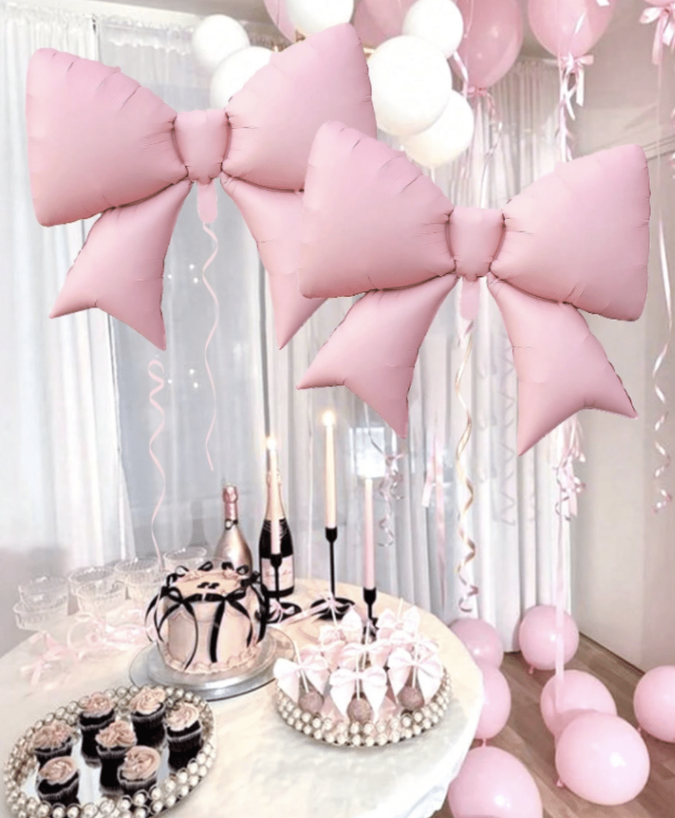 Елегантен и нежен фолиев балон във форма на голяма панделка в пастелно розов цвят – стилен акцент за модерна и романтична парти декорация 💗