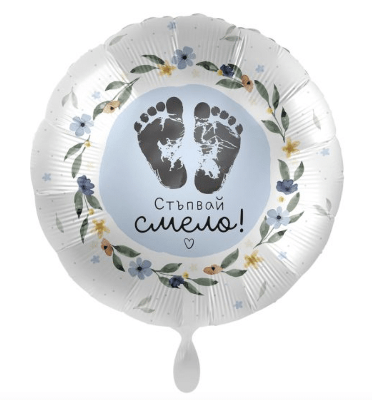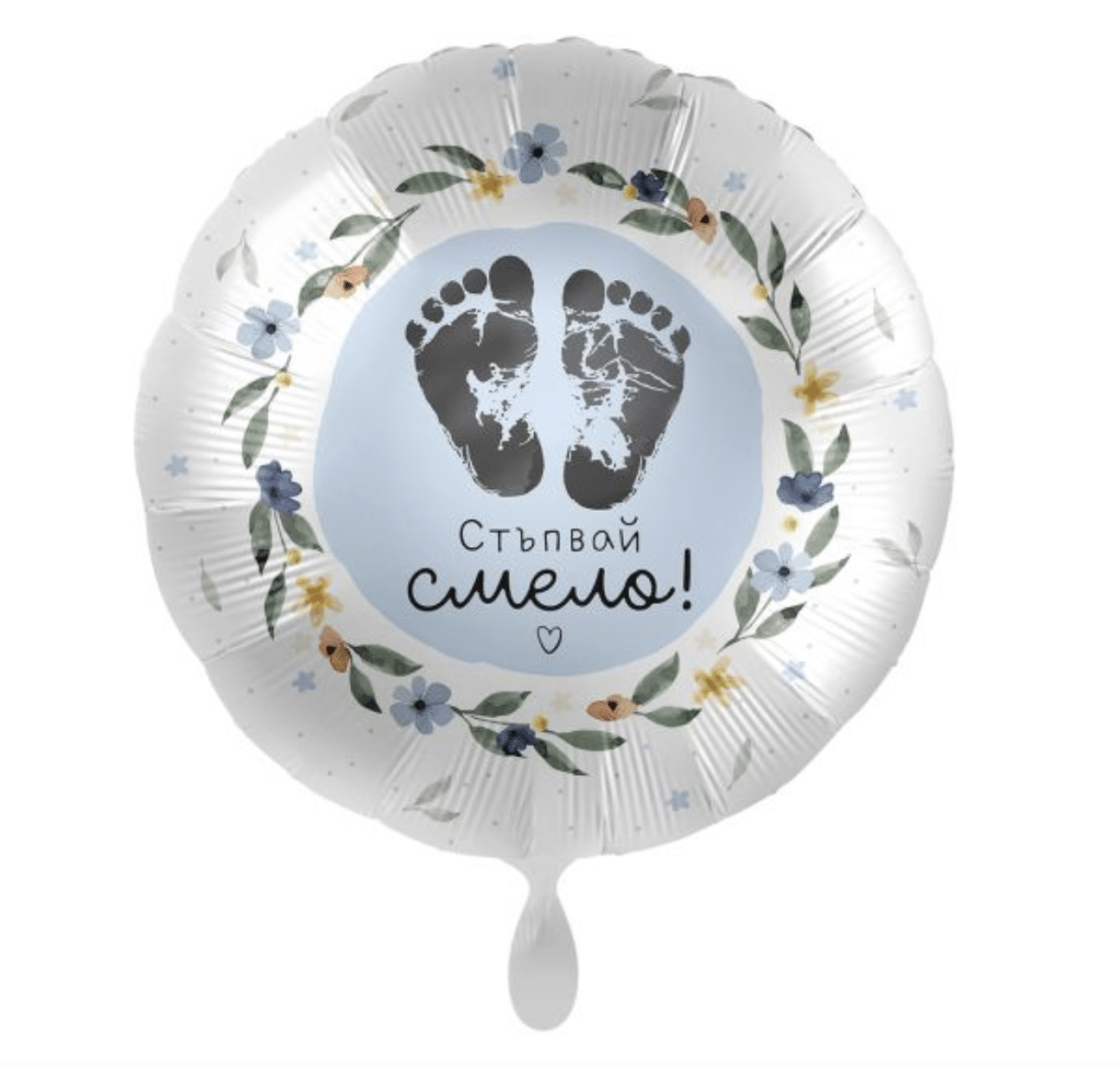 Нежен и красив фолиев балон с надпис „Стъпвай смело!“ – перфектен избор за подарък или украса за бебешко парти, кръщене или първи рожден ден. Балонът е в кръгла форма, декориран с флорален венец и отпечатъци на бебешки стъпки – символ на ново начало и обич.