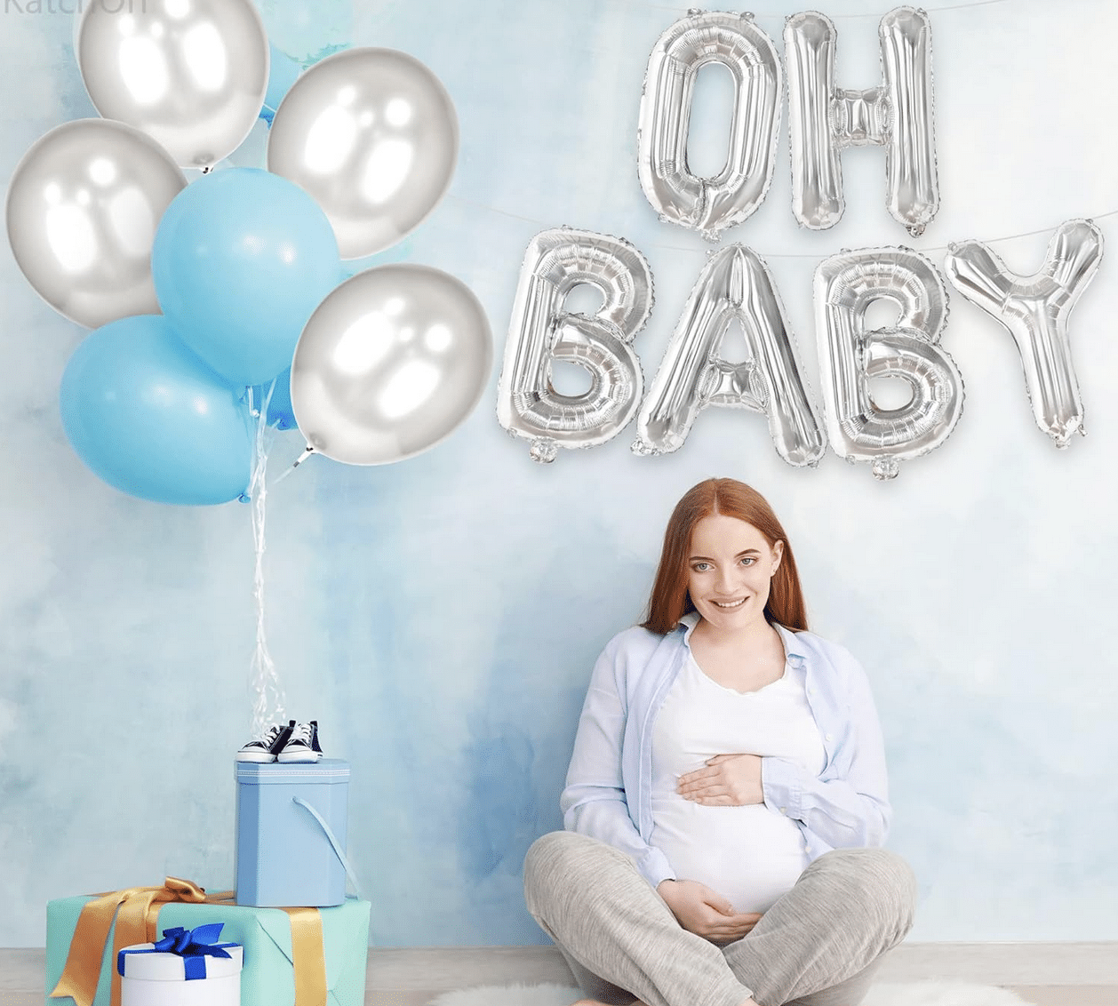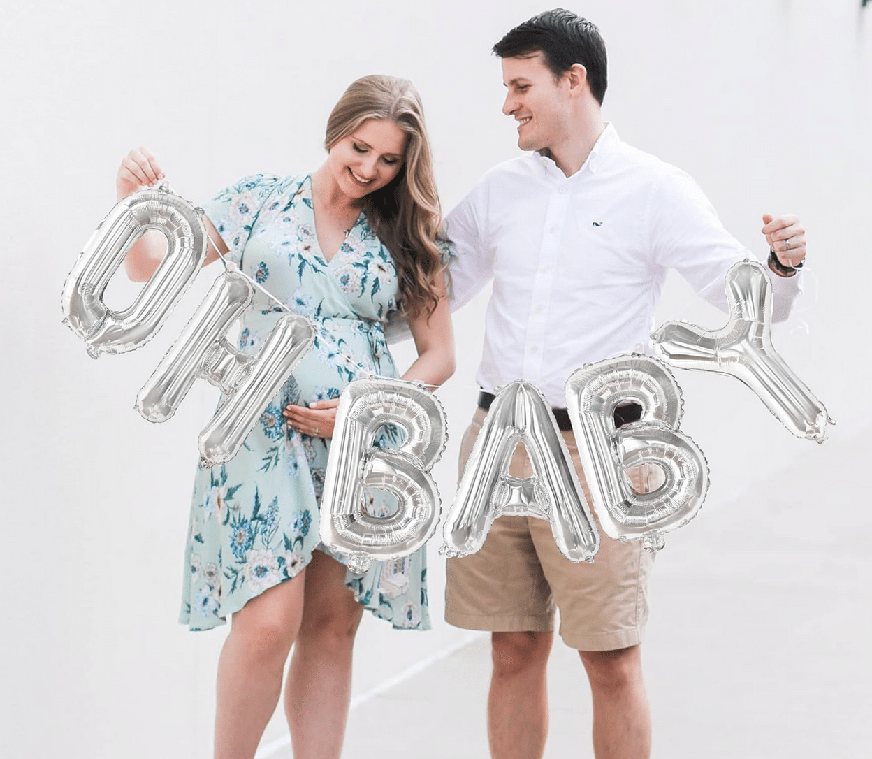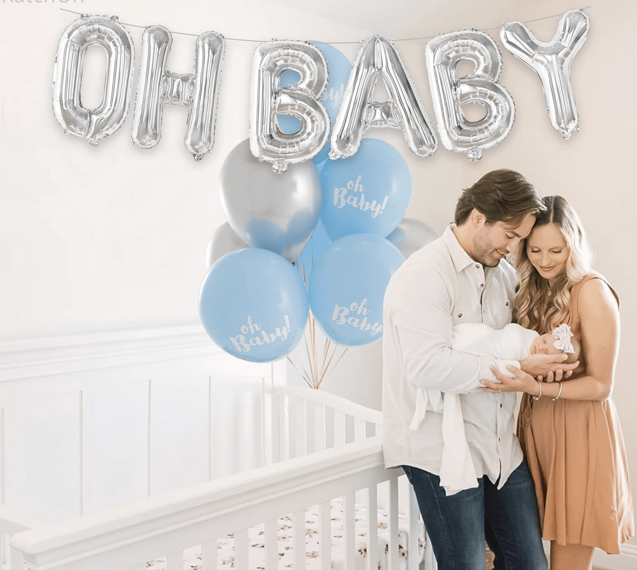 Стилен и модерен фолиев банер с надпис „OH BABY“ в елегантен сребърен цвят – перфектен избор за бебешко парти, baby shower, погача или посрещане на новородено. Среброто придава изискан и нежен акцент и се комбинира отлично с пастелни и неутрални декорации.