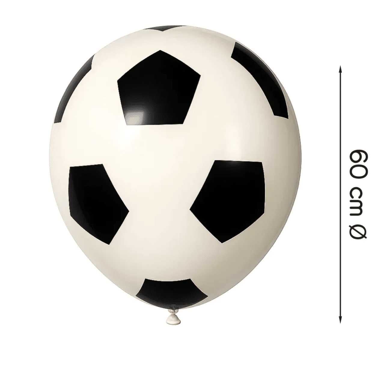 Голям латексов балон във формата на футболна топка с диаметър 60 см, идеален за футболни партита, детски рождени дни и спортни тематични събития. Класическият черно-бял дизайн създава автентична футболна визия и е подходящ за декорация както на закрити, така и на открити пространства. Балонът може да се надува с въздух или хелий и е изработен от здрав латекс за добра еластичност и устойчивост.