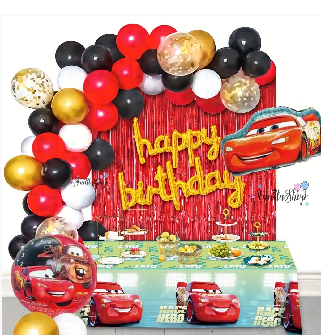 Комплект съдържа :1 брой надпис от балони HAPPY BIRTHDAY| 1 брой ресни с размери 100 х 200 см | 45 броя латекс балона х 26 см и 4 латекс балона със конфети| 1 балон кола с размер 60 см | 1 броя тематичен балон 45 см | 20 лепилни точки, лента за арка и голяма ръчна помпа.