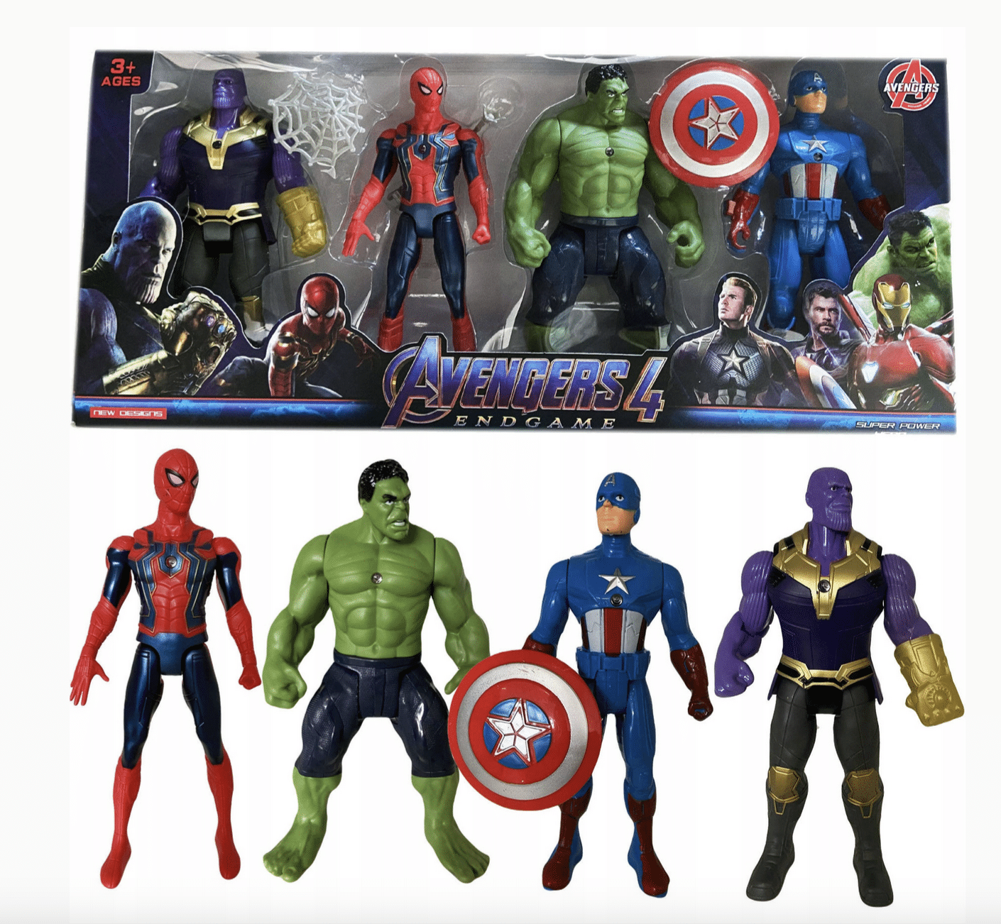 Комплектът включва: 4 фигурки (Spider-Man, Hulk, Captain America, Thanos)