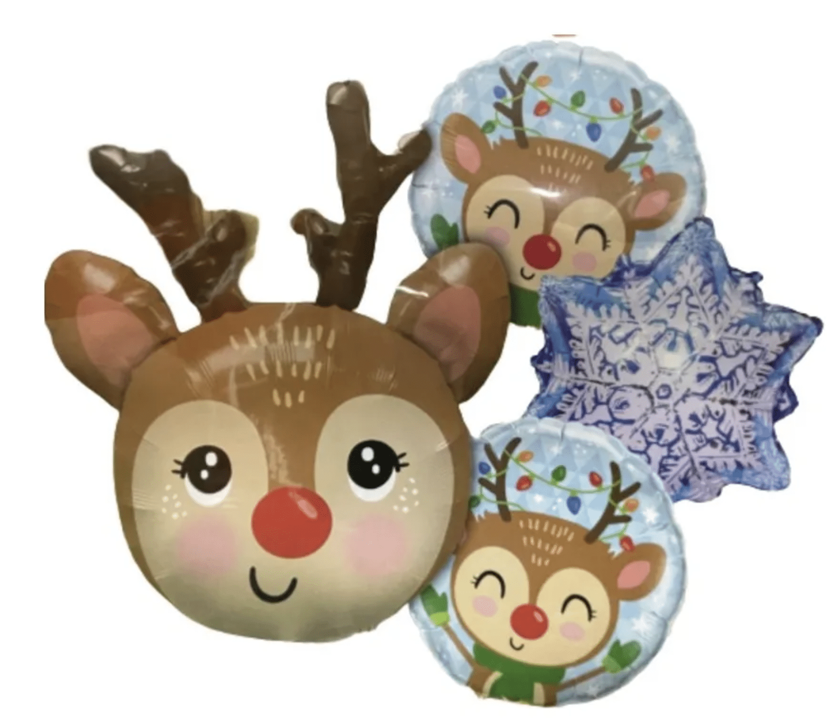 Създайте нежна и празнична атмосфера с този очарователен комплект фолиеви балони с коледно еленче. Комплектът включва един голям балон с размер 60 см и три по-малки балона с размер около 45 см, с весели зимни мотиви – усмихнато еленче и снежинка.