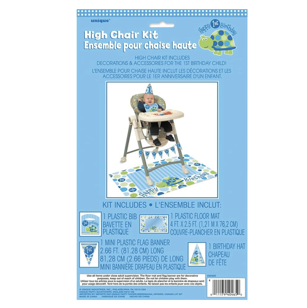 Направете първия рожден ден на Вашия малък герой незабравим с този пълен комплект за декорация на столче за хранене! Дизайнът с усмихната синя костенурка добавя весело и празнично настроение към най-важния кът на партито – мястото, където рожденикът ще опита своята първа торта.
