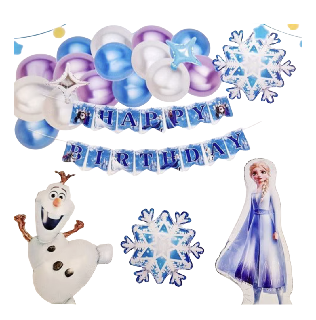 Комплектът съдържа :1 брой тематичен банер Happy Birthday | 1 брой балон фолио Олаф – 70 см | 1 брой фолио Елза – 80 см | 1 брой фолио снежинка – 60 см | 1 брой фолио снежинка – 30 см | 2 броя мини звезди – 20 см + 18 броя латекс балони | лента за арка 5 метра и голяма ръчна помпа