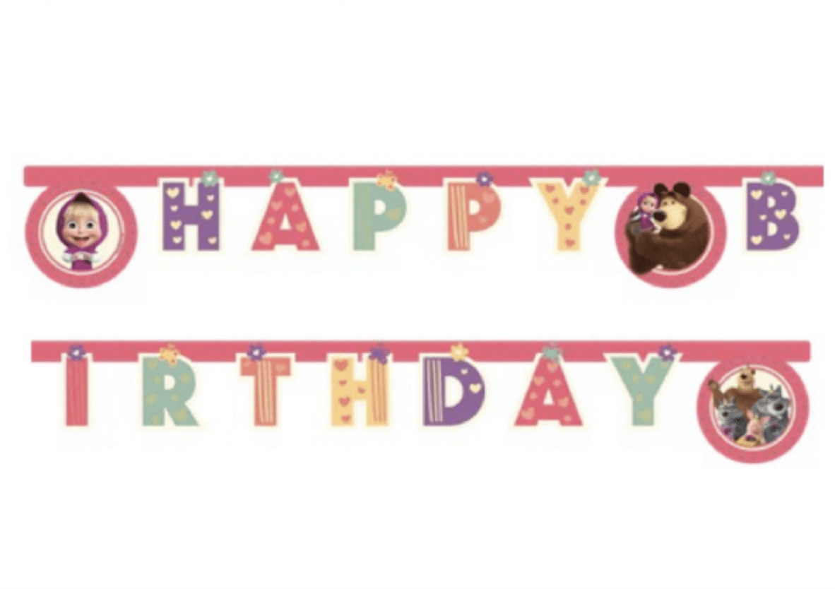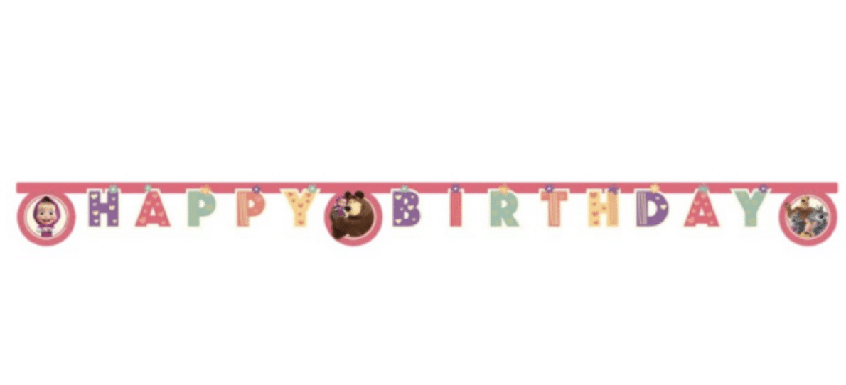 🎀 Официален лиценз Маша и Мечока – Procos 🎉 Надпис „Happy Birthday“ с героите на Маша 📏 Дължина: 2 метра 🎈 Лесен за окачване – подходящ за стена, маса или вход 💜 Пастелни цветове в розово и лилаво