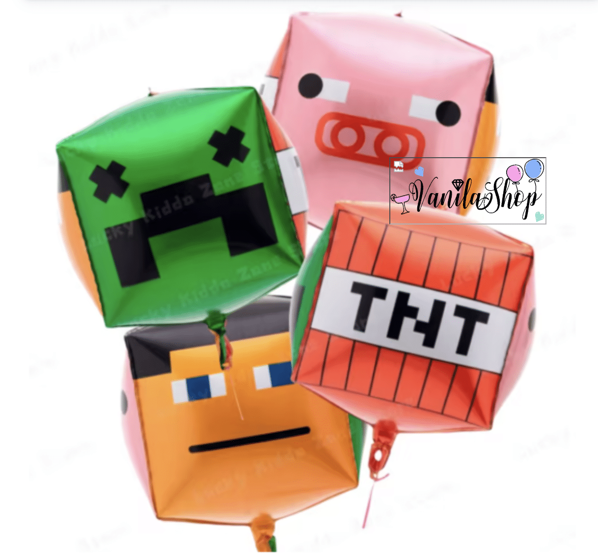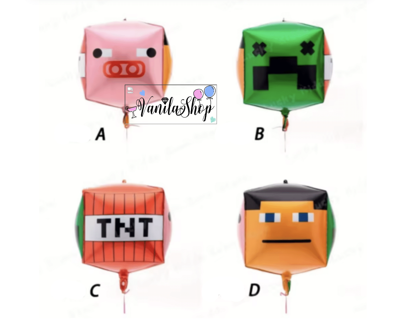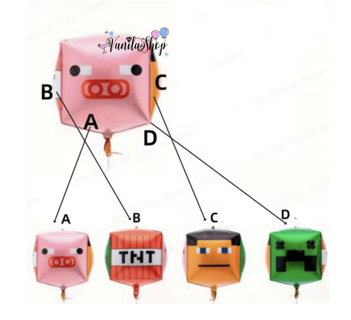 Този впечатляващ 4D фолиев балон с размер 56 см е идеален за детски партита, тематични тържества и декорации. Балонът е във формата на куб и има четири различни лица, всяко със забавен пикселиран дизайн: животинско лице, зелено чудовище, TNT блок и герой с квадратна глава.