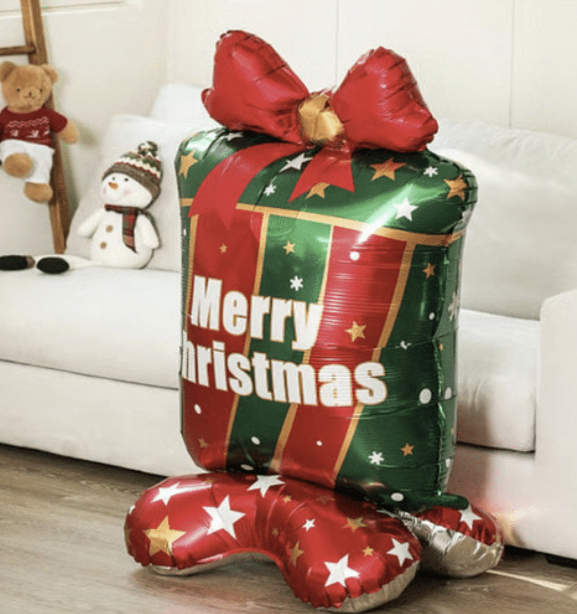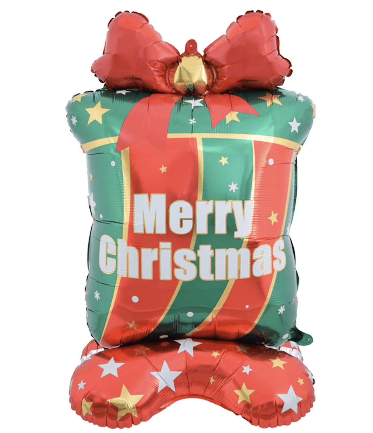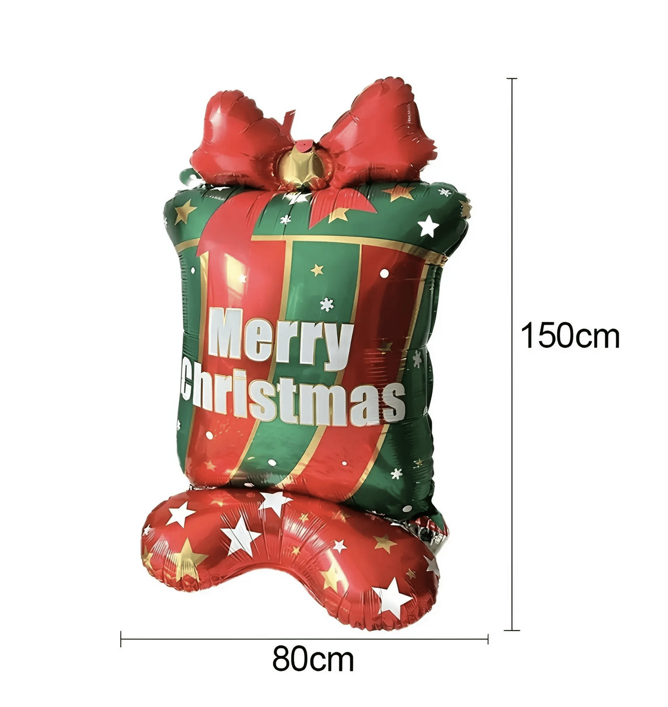 Създайте впечатляваща празнична атмосфера с тази голяма надуваема коледна фигура във формата на подарък, декорирана в традиционни червено-зелени цветове и надпис “Merry Christmas“. Моделът е изработен от здрав, лек и блестящ фолио материал, който придава ярък и празничен вид.