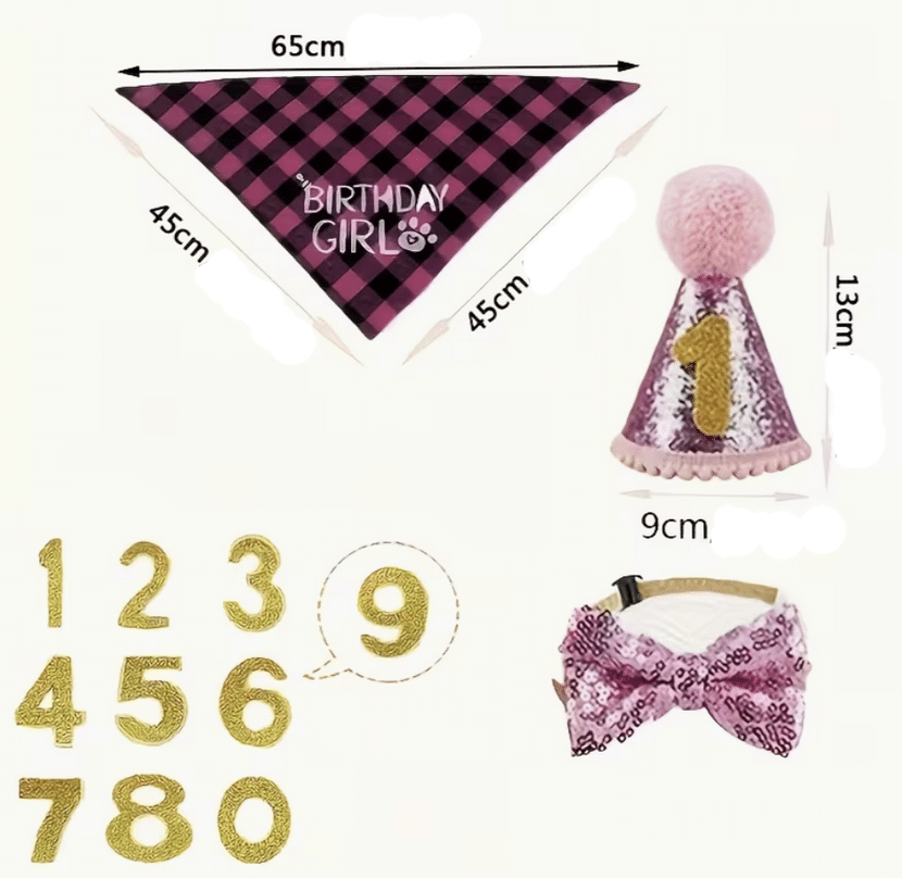 • Детайли: Покрита с розови пайети и мек помпон на върха. В комплекта са включени златни цифри от 0 до 9, които могат да се сменят върху шапката според възрастта на Вашето любимче.