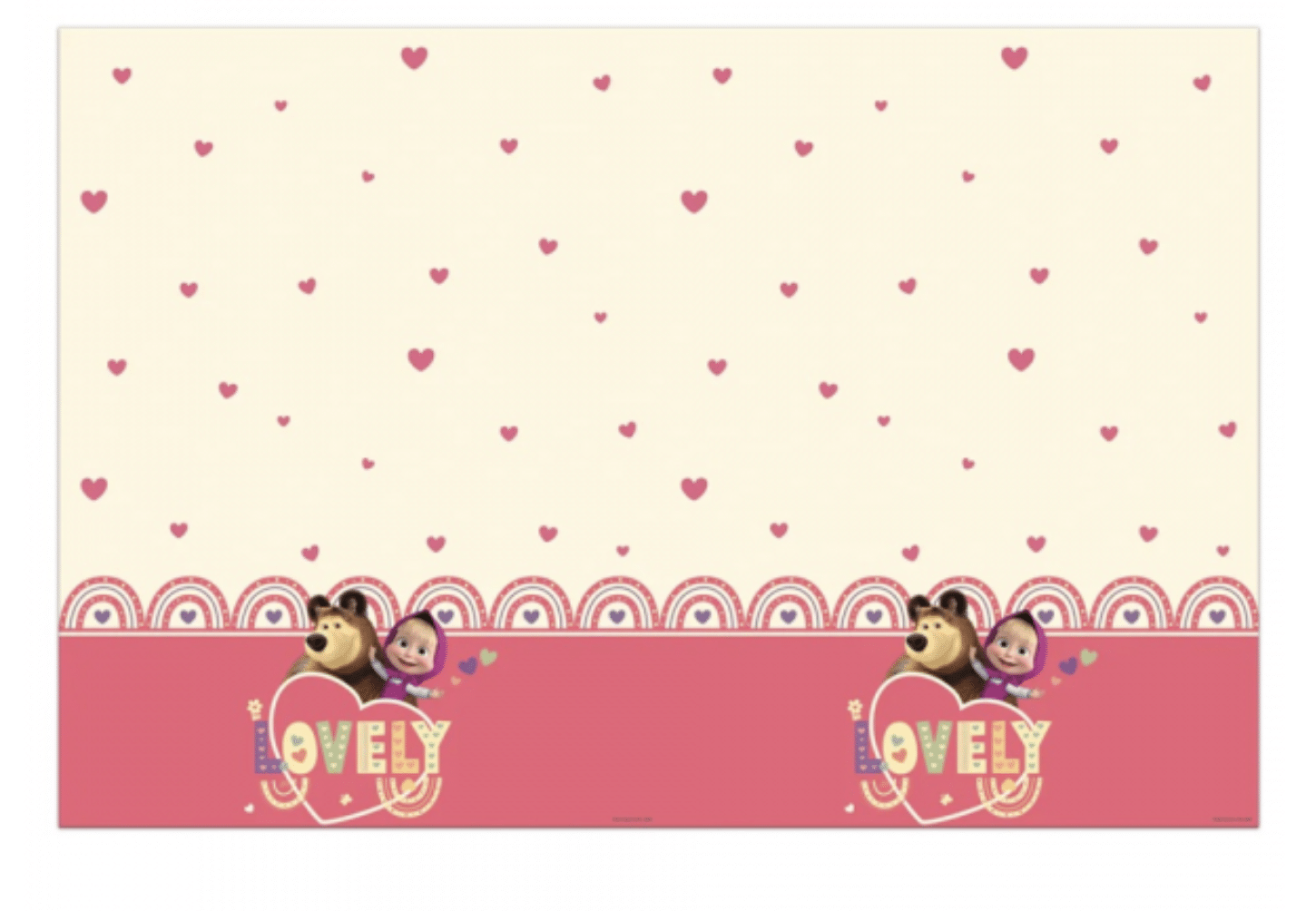 Създайте вълшебна парти маса с тази очарователна покривка на любимите Маша и Мечока! Кремавият фон с розови сърца и цветният борд с надпис „Lovely“ правят масата неустоимо красива за всяко детско празненство.