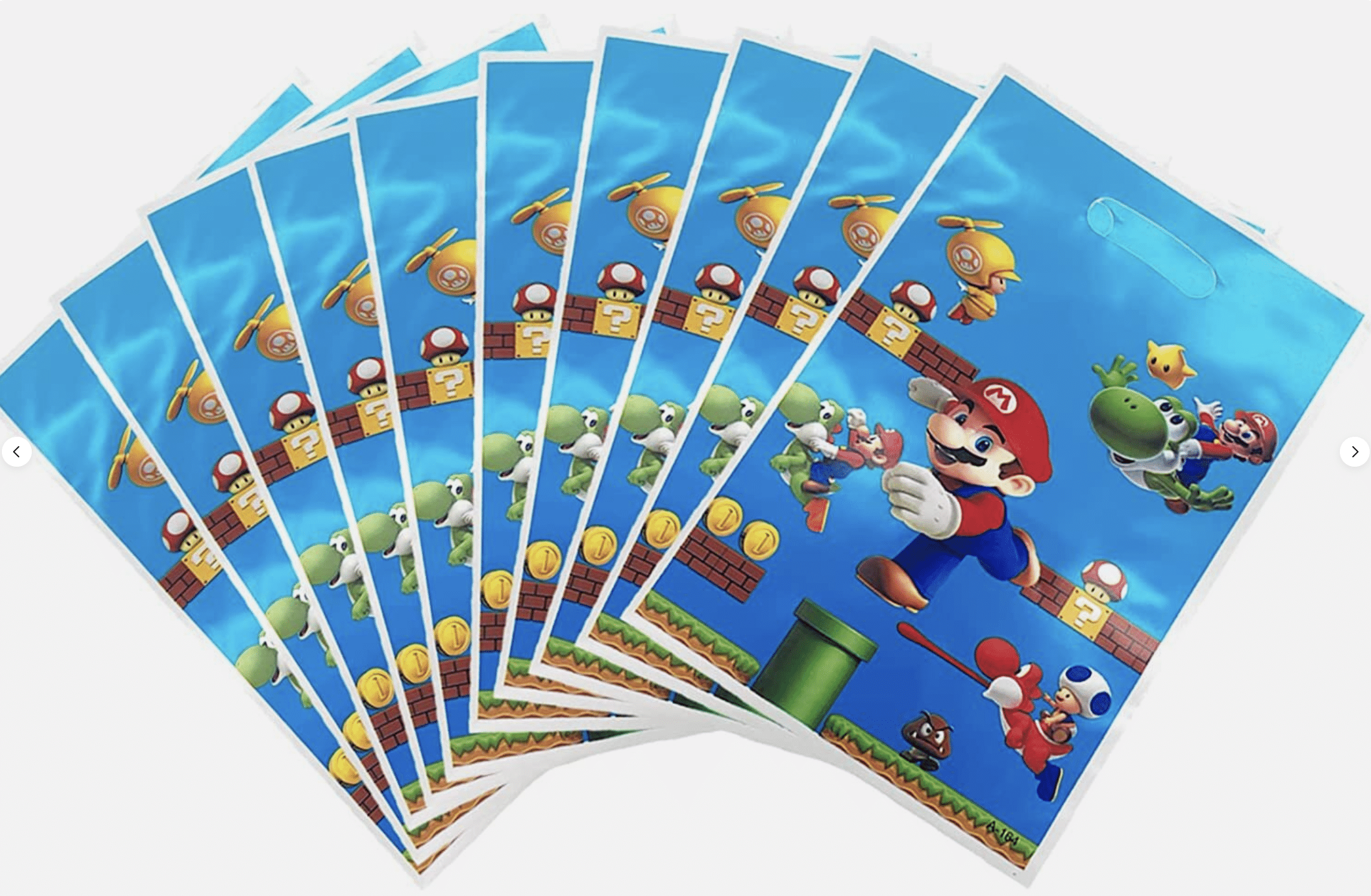 Цветни и забавни подаръчни торбички с героите от Super Mario, идеални за детски партита и тематични празненства. Яркият дизайн с Марио, Йоши и приятели веднага привлича вниманието на децата и допринася за празничното настроение.
