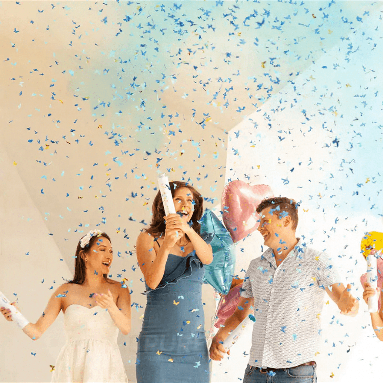 Създайте незабравим момент при разкриване пола на бебето! Този конфети канон работи със сгъстен въздух и изстрелва красиви сини хартиени конфети, които се разпръскват във въздуха и създават впечатляващ ефект.