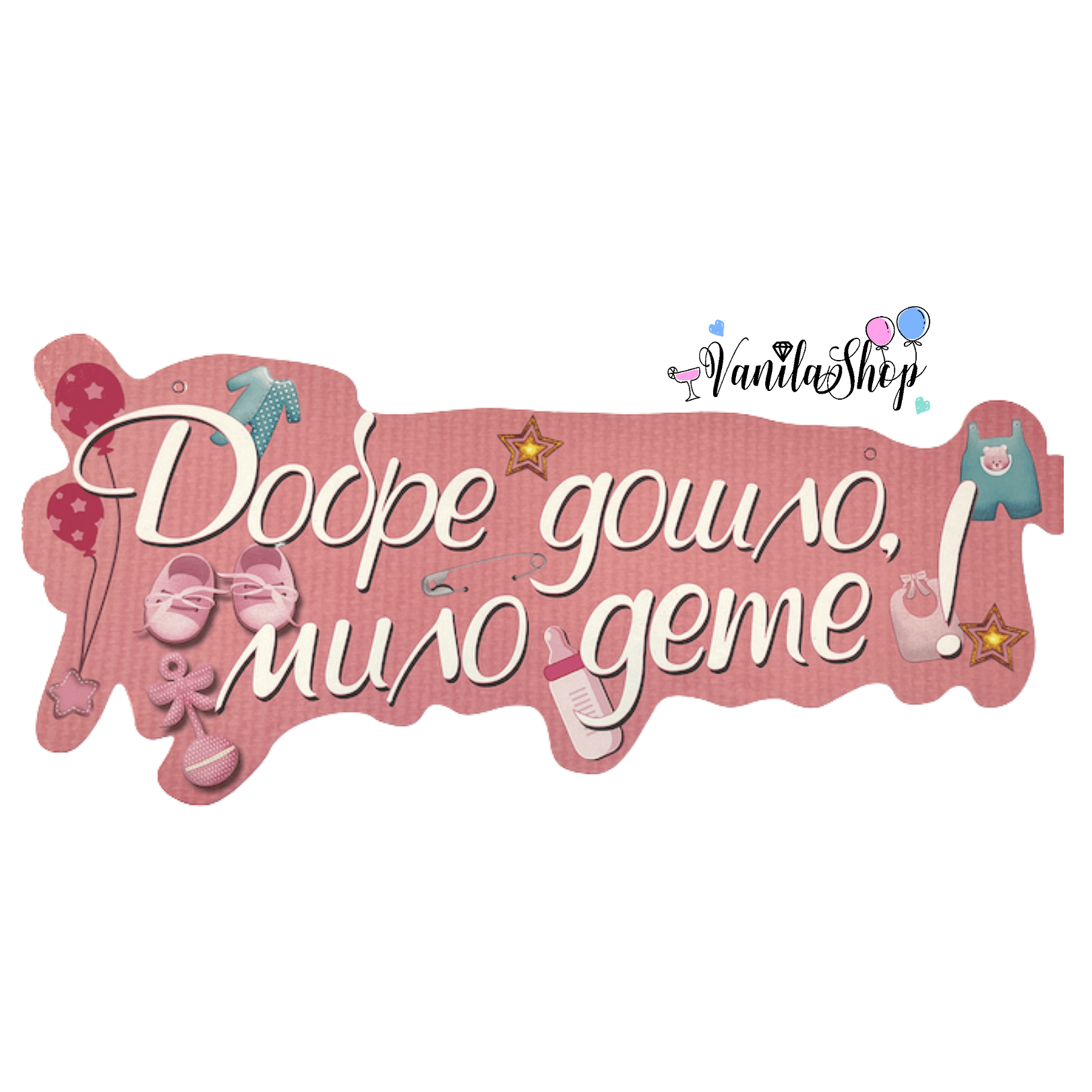 Парти украса – Надпис “Добре дошло мило дете” – розов – може да се закачи с връзка или двойно залепваща лепенка . Размер – 46 х 21 см Цената е за 1 брой.