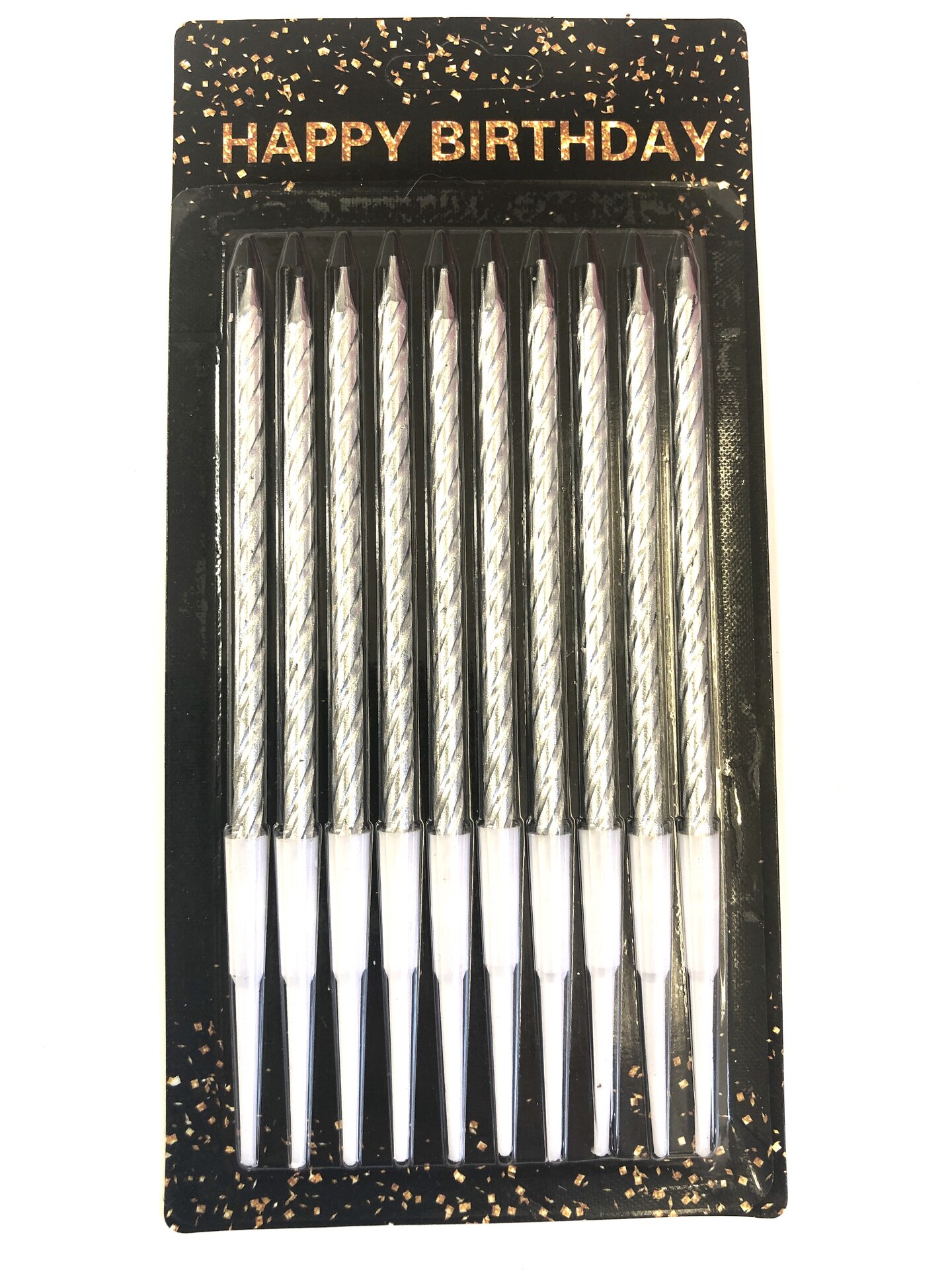 Парти свещички за торта в сребърен цвят с височина 10 см само свещичката и поставка 3 см – 10 броя