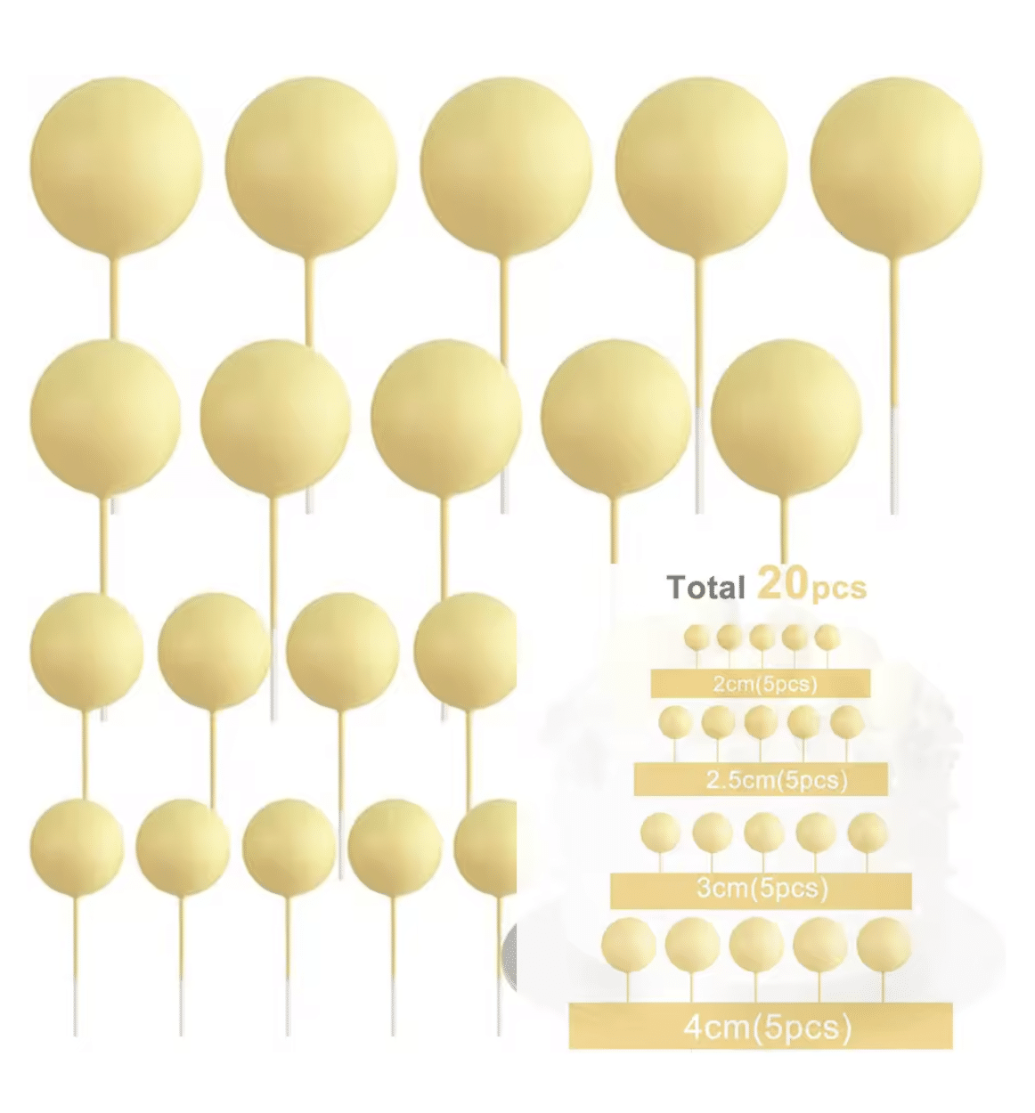 Комплект: 20 броя декоративни топчета, достатъчни за украса на средно голяма торта или множество сладкиши.