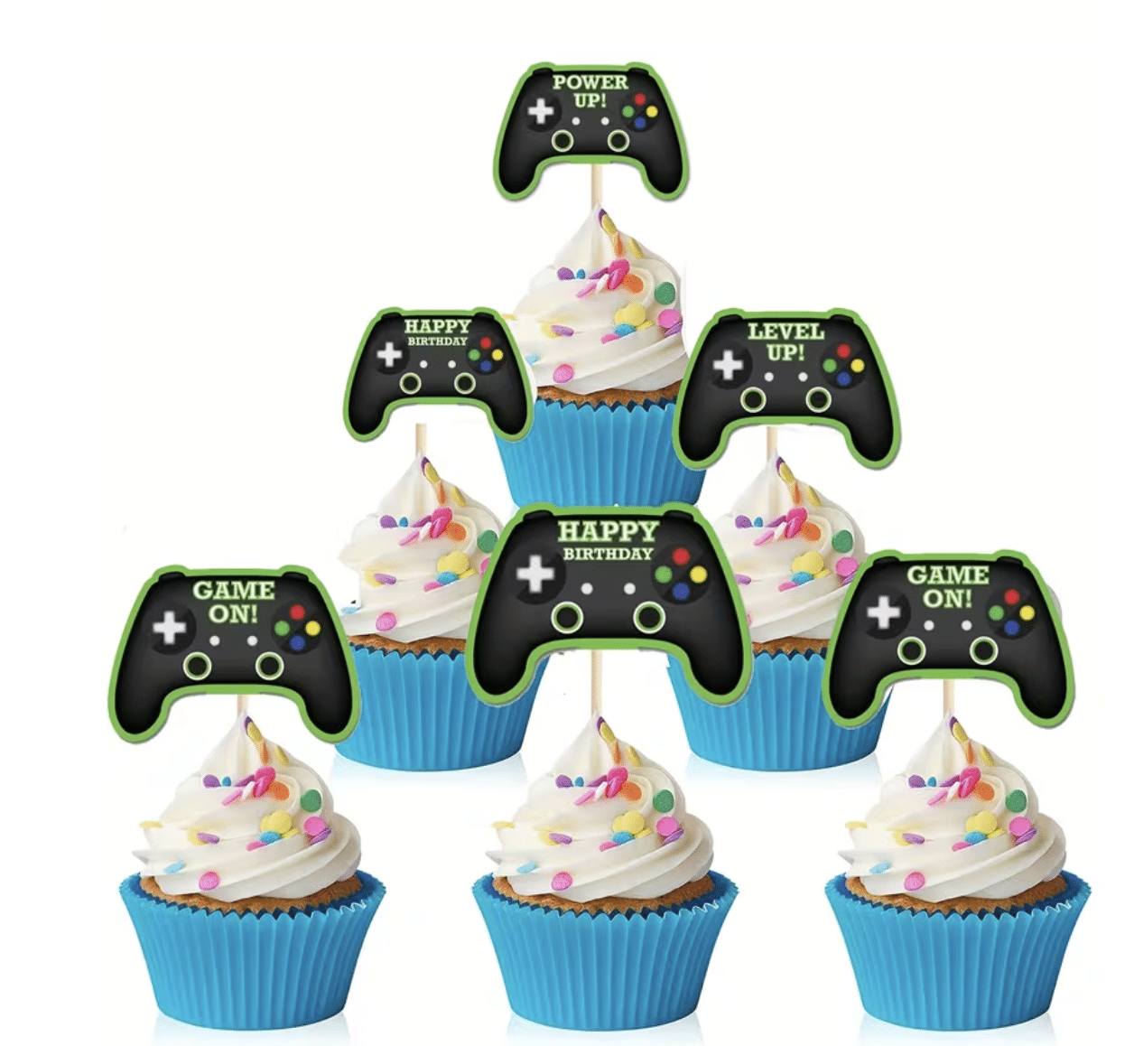 Ефектни хартиени топери с дизайн на гейм контролер, идеални за украса на мъфини, кексчета и торти за детски рожден ден или геймърско парти 🎉