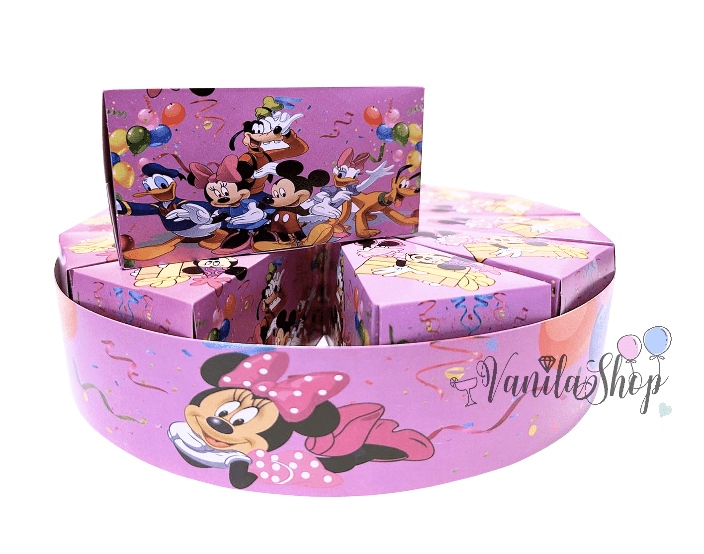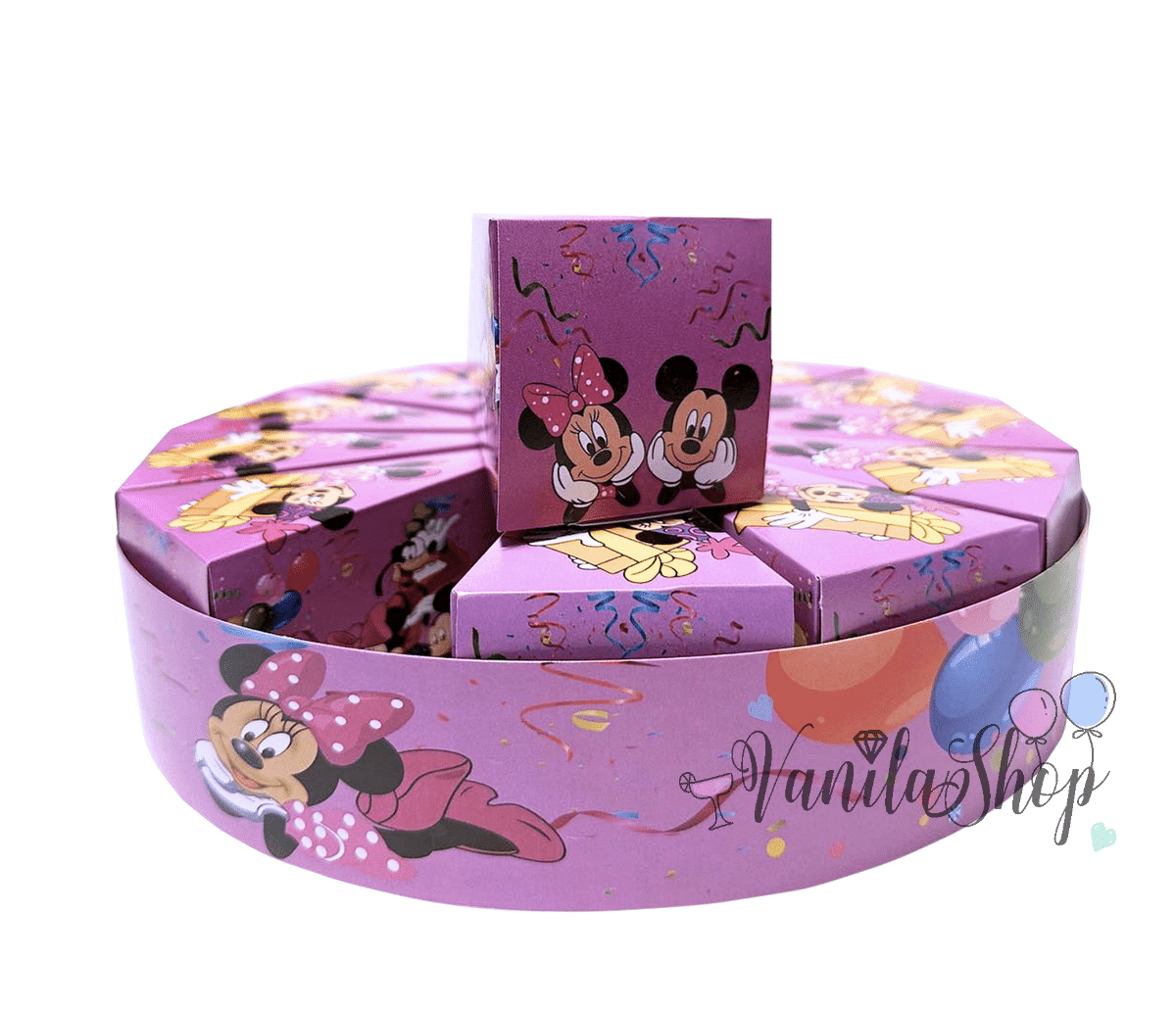 Страхотна картонена торта която се състои от 13 парчета.В тях може да сложите малки играчки и бонбони.Тортата се доставя в разгънат вид. Парчетата се сгъват бързо и лесно без лепене и се съединяват с тематична декорираща лента включена в комплекта Цената е за 13 парчета ( цял кръг ) + тематична декорираща лента