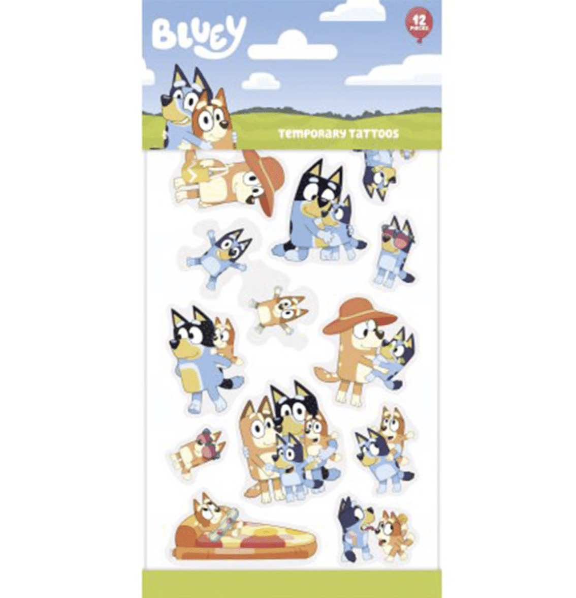 Забавен комплект временни татуировки с любимите герои от анимационния сериал Блуи (Bluey)! Идеални за детски рождени дни, партита, подаръчни торбички или просто за игра у дома.
